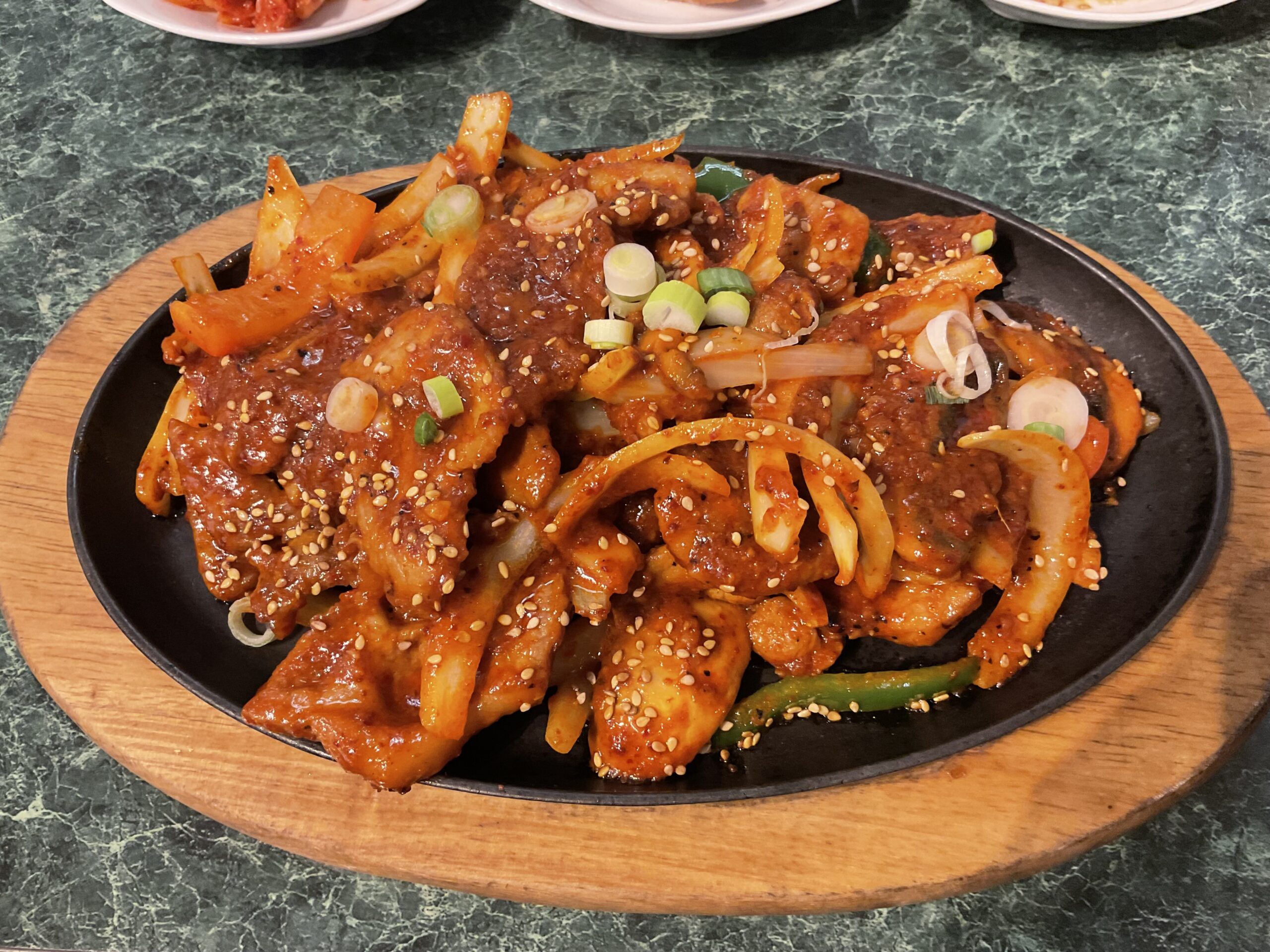 Pork Bul Go Gi 牛肉の味付けとは違って、豚肉の方は濃いめの甘辛味噌です。辛味は結構あるので苦手な方は牛のプルコギかカルビをお勧めします。