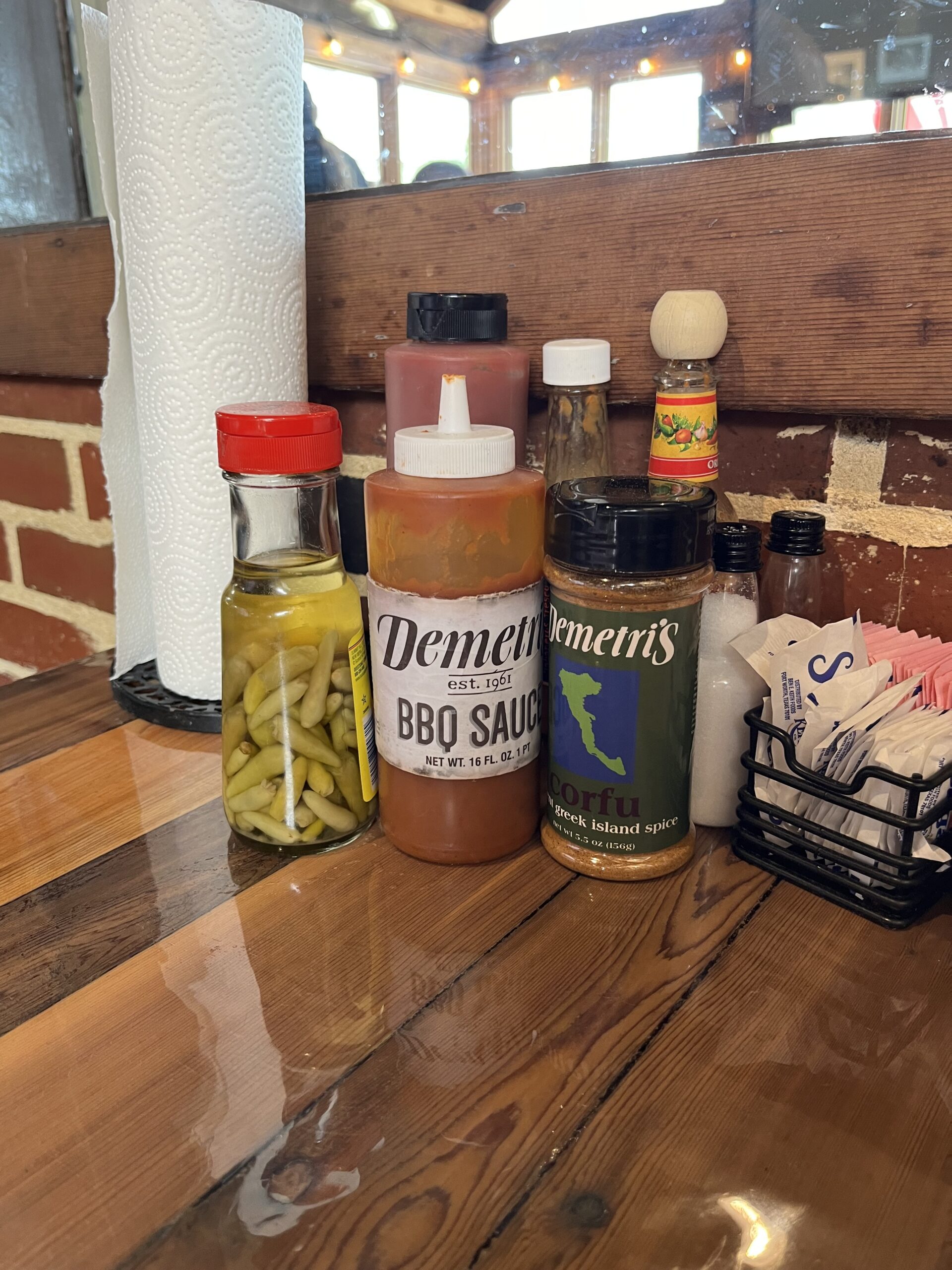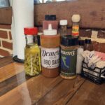 席には卓上調味料が色々置いてあります。写真が分かりづらくて申し訳ないのですが、手前の3つは、左から青唐辛子入りビネガー(それほど辛みはなく、砂糖も入っていないので、お肉をさっぱり頂くのにはちょうどいいです)・デミトリー特製バーベキューソース(やや甘め)・デミトリー特製スパイス入り塩(ちょっとスパイシーなお塩です、何にかけても美味しいです)デミトリーのソースと塩は店内で購入可能です。