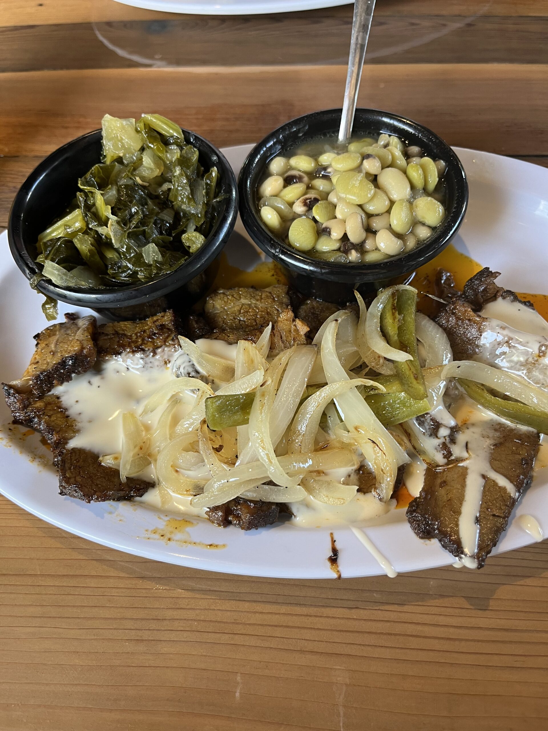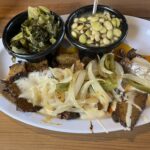 Brisket Plate 牛の肩バラ肉のバーベキューにEl Rancho エルランチョと言うチーズソースを足してもらった物です。サイドメニューからターニップグリーンとSucootash サコタッシュ(とうもろこしをメインに豆類やパプリカ等を煮込んだ物です。お店によってとうもろこし以外の材料が違ったり、ベーコンが入っていたりと様々ですが、味は基本コンソメの様です)エルランチョをかけてもらう事はあまりお勧め出来ません。かなりヘビーな食事になってしまいます。
