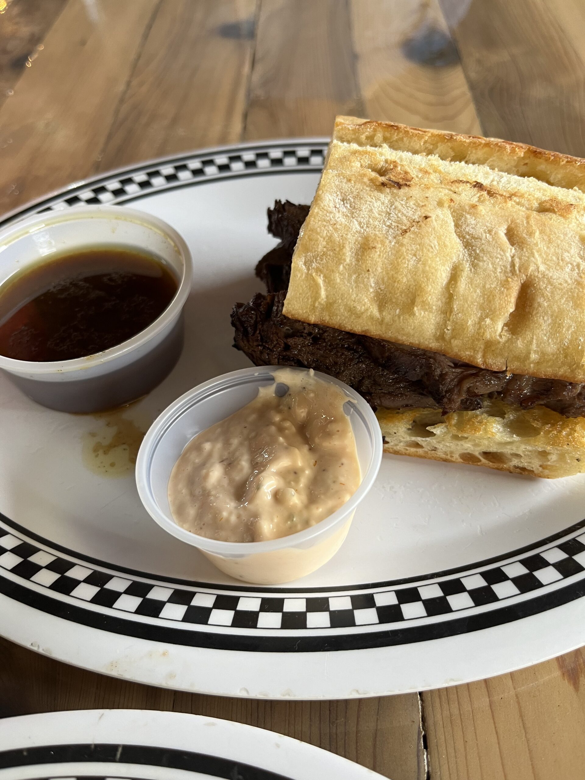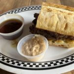 写真右は同じくRibeye Steak Stripsのサンドイッチになります。ソースはサウザンアイランドの様なマヨベースの物と、濃いコンソメスープの様なソースでたっぷりサンドイッチを漬けて食べるタイプの2種になります。