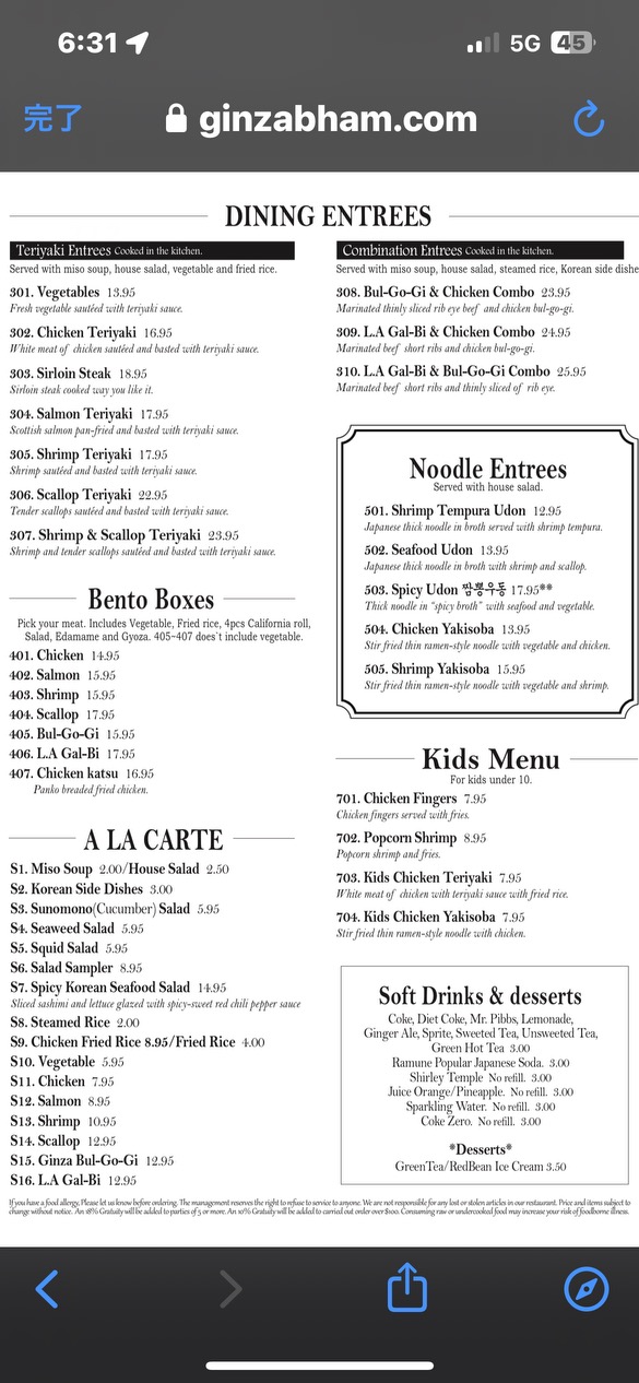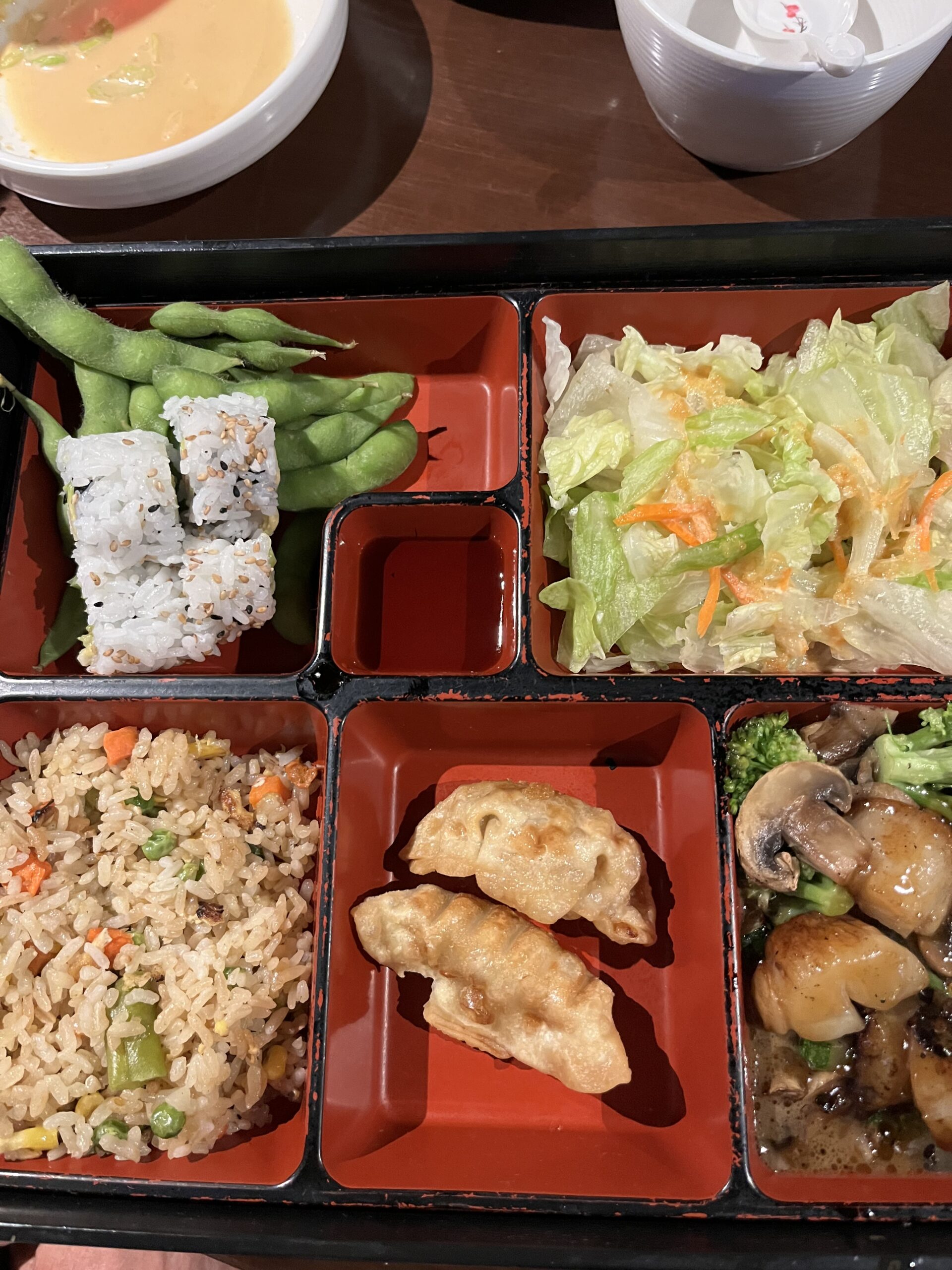 Dining Entreeのメニューには、照り焼き(メイン、スープ、サラダとチャーハン付)弁当ボックス(メイン、カリフォルニア巻き、枝豆、餃子、サラダとチャーハン)お店で焼いて出してくれる焼肉セット(焼肉、味噌汁、サラダ、ご飯とパンチャン)他には天ぷらうどんや焼きそば等があります。