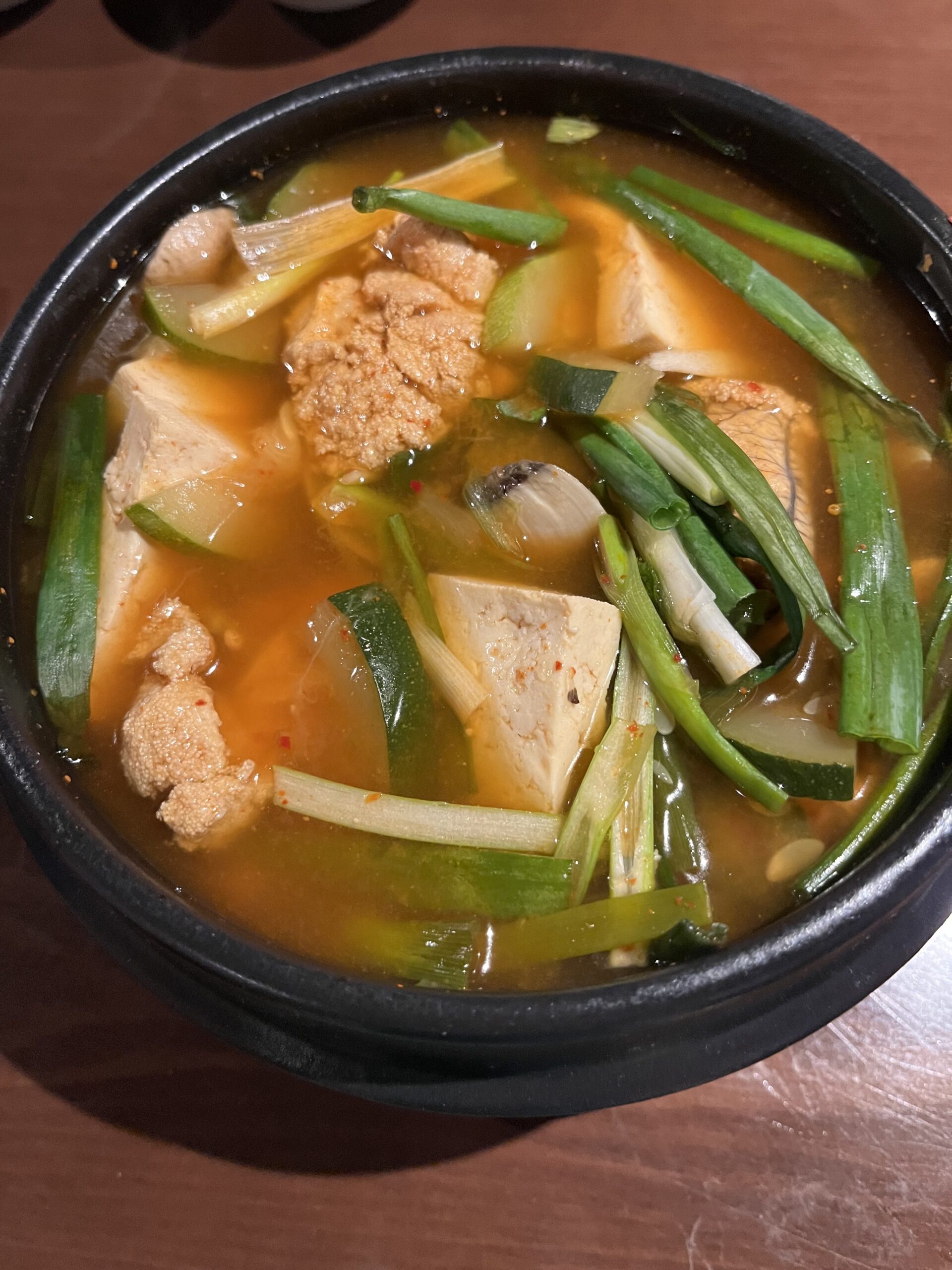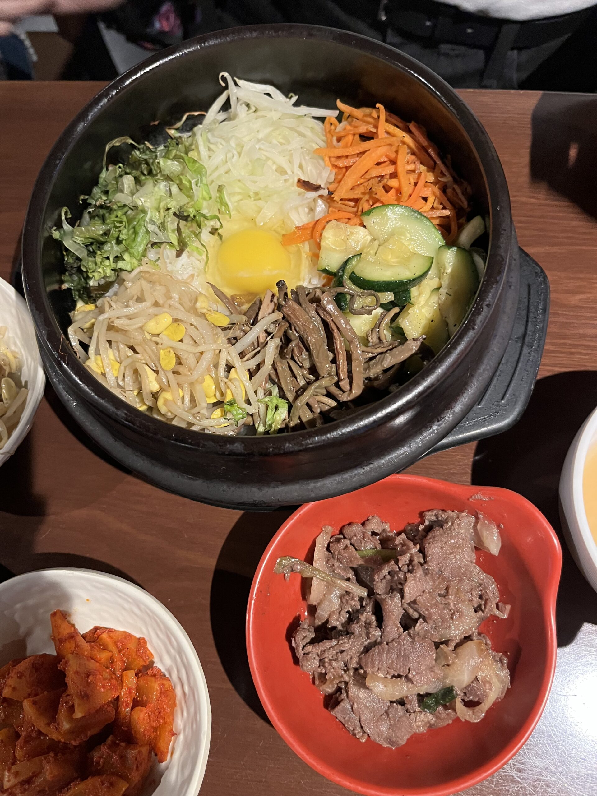 左からBento Boxの海老、石焼ビビンバ(右下に映るプルコギを足しました)そしてKorean EntreeからAl-Tang/チゲに魚卵が入ったものです。このスープは辛さを調節してもらえます。魚卵は日によって違うらしいので何の魚の卵かお聞きになった方がいいと思います。ちなみに上記はタラの魚卵でした。とても食べきれな程入っていて、そのおかげで出汁も効いて美味しかったのですが、痛風チゲですか?と思ってしまいました。(笑)
