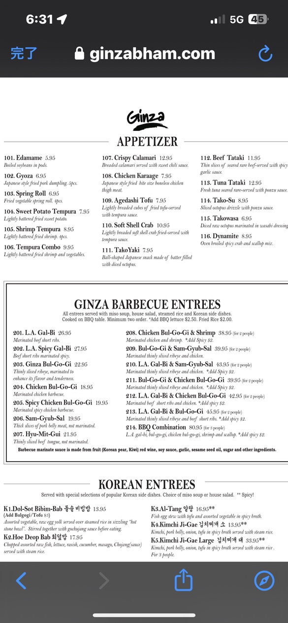 アペタイザーには唐揚げやたこ焼き、枝豆など居酒屋メニューがあり、BBQはL.A.Gal-Bi/カルビ Bul-Go-Gi/プルコキ Sam-Gyob-Sal/サムギョプサルやHyu-Mit-Gui/薄切り牛肉の焼肉、カルビとプルコギのコンビや海老とのコンビなど豊富です。EntreeメニューにDol-Sot-Bibim-Bab/石焼ビビンバ Kimchi Ji-Gae/キムチチゲなどがあります。
