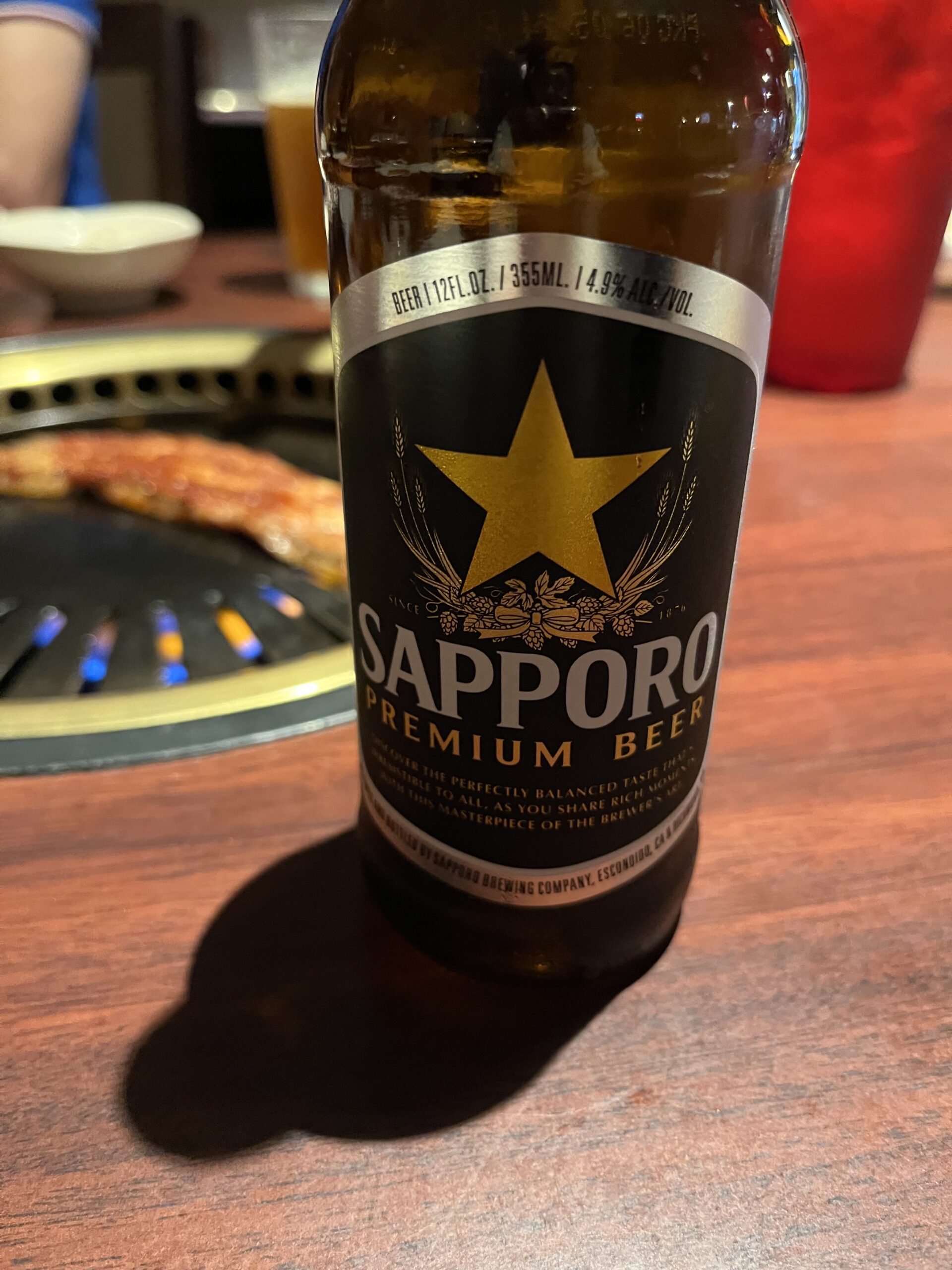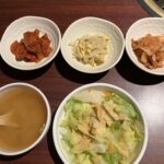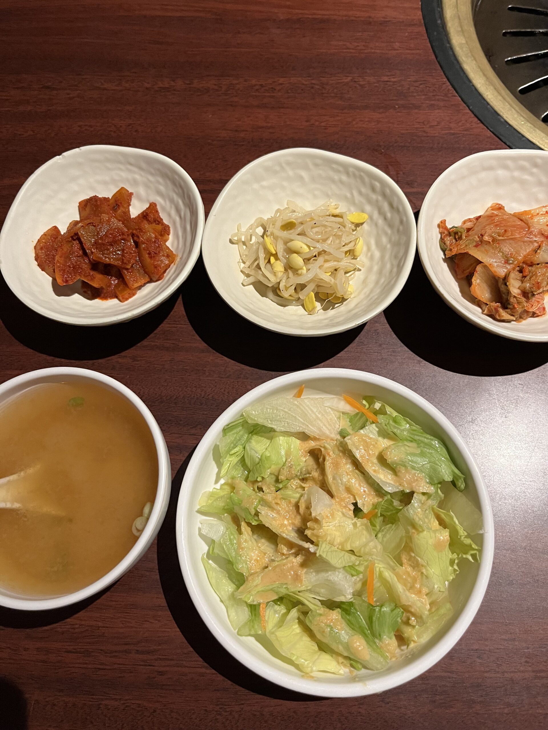 焼肉を頼むと付いてくる、ご飯(すみません。写真には写っていません。お寿司のお米は日本のお米ですが、その他のメニューに付いてくるご飯は寿司米ではなく米粒の少し小さいご飯です。)味噌汁、サラダとパンチャン(白菜キムチ、大根の甘辛味漬け、もやしのナムル)です。日本のビールもありました。