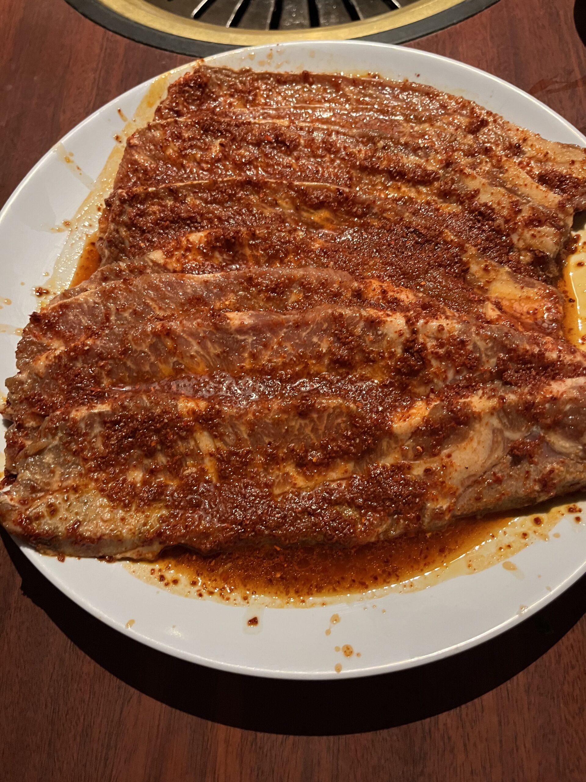 これは全くの個人的意見ですが、こちらのカルビの味付けがなんとなく薄く、またサムギョプサルも日本で出てくる様なニンニクと塩が効いた味付けではありませんでした。尚薄切り肉とプルコギはまだ食べた事がありません。ただこのスパイシーカルビは本当にお肉も味付けも美味しく、自分達で焼ける楽しさから何度もリピートしているメニューです。