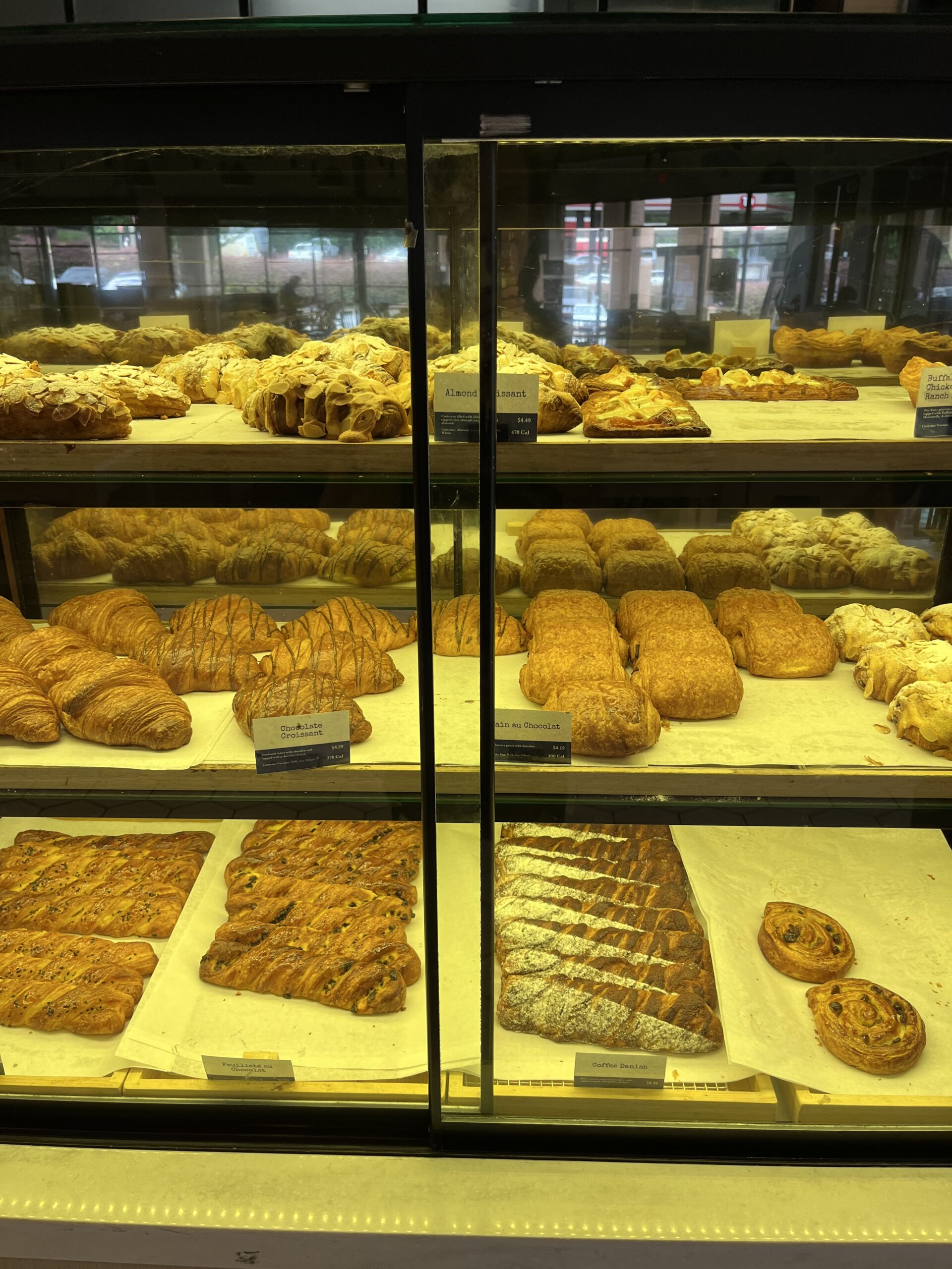 ケース内には20種類ほどのパンが並んでいます。日本でもお馴染みのスタイル、トングでトレーに乗せてお会計です。