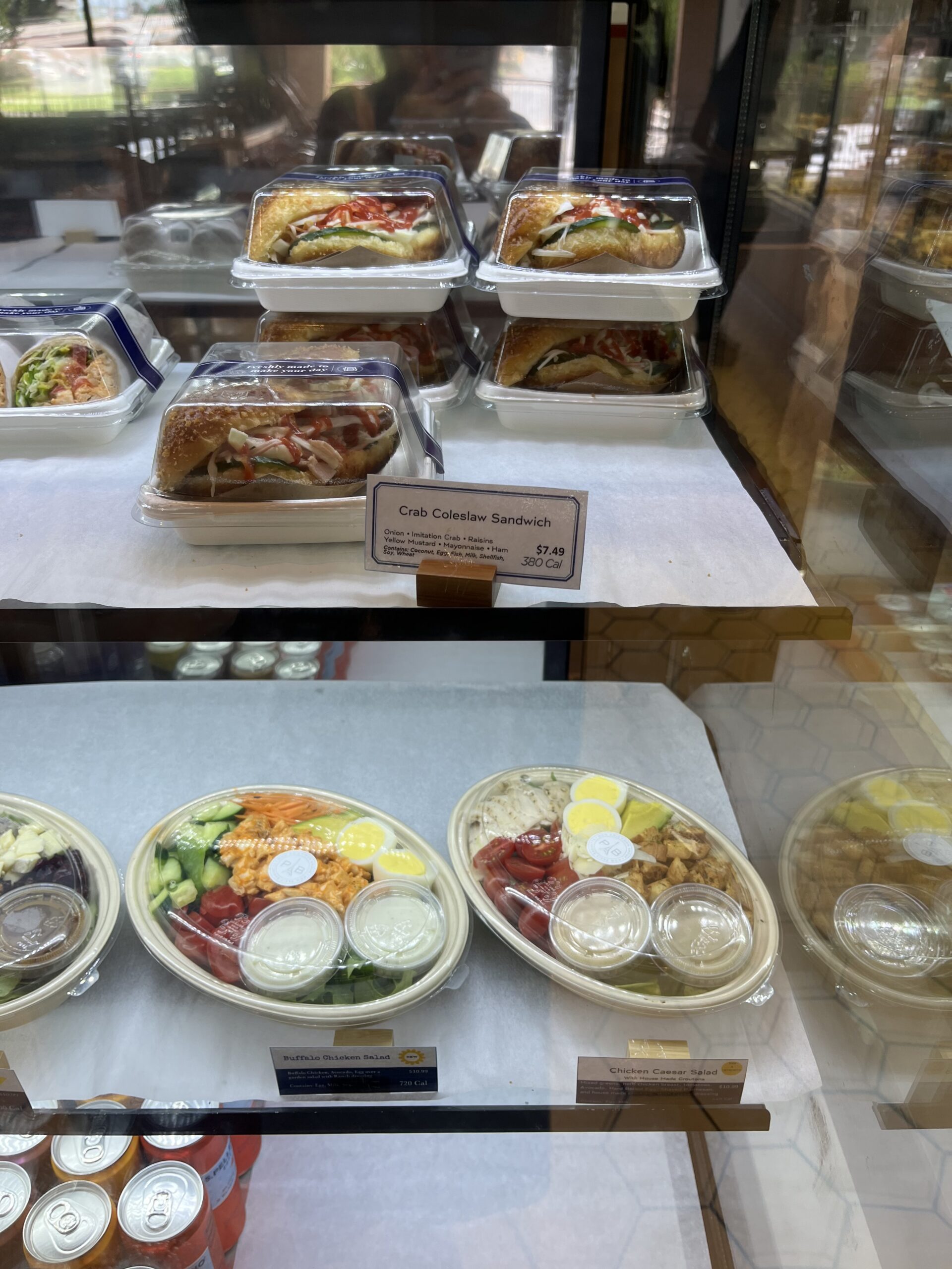 チルドのコーナーにはサラダやサンドイッチ等も売っています。パンと合わせるとしっかり食事も出来そうです。会計のカウンターではコーヒーなどの飲み物も頼めます。