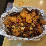 ランチメニューの種類は日替わりも含め30種あり、赤い文字と唐辛子マークのメニューは辛いお料理です。写真は月曜の日替わりGreat Wall Comboで、海老、鶏肉と牛の甘辛炒めです。ご飯はタイ米のようですが、Fried /チャーハンか白いご飯が選べます。