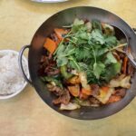 左からSpicy Lamb with Vegetables in Flaming Pan(メニューの漢字が見つかりませんでした)火がついたまま運ばれてくるので熱々、そして激辛です。夜はご飯がおひつで提供されます。$2.25プラスでEgg Fried Rice 卵チャーハンも選べます。