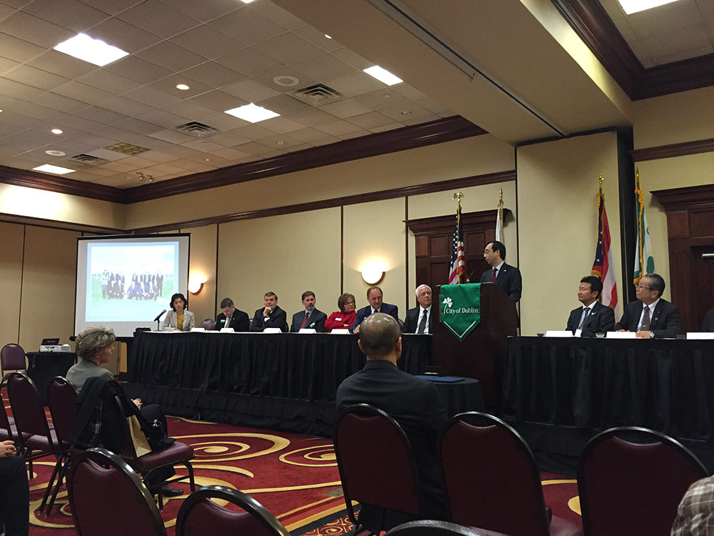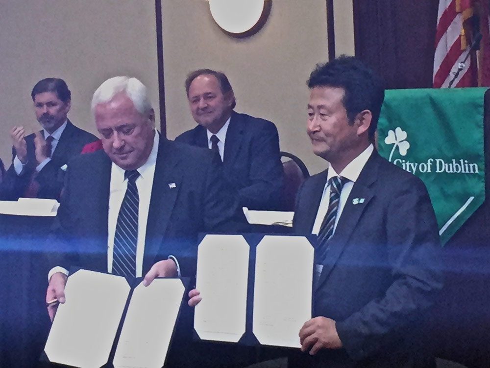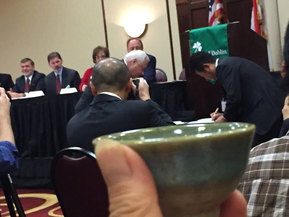 ダブリン市よりお招きを受け2015年12月15日、栃木県益子町とオハイオ州ダブリン市の友好都市提携をお祝いする祝賀会へ参加させて頂きました。ダブリンと益子町を繋いだのは和太鼓。林英哲さんの指導を受けた二つの和太鼓のグループが二つのまちを結びつけました。大塚町長も加わってソウルフルなパフォーマンスでした。会場では益子焼きのぐい飲みで地酒が振舞われました。