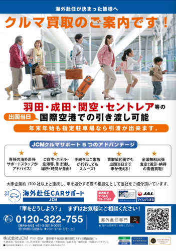 JCMさんは、「車の売却」から「面倒な手続き」まで、丸ごとサポートしてくださる頼もしい会社です!!もし、車の売却に困ったいる方がいらっしゃったらお問い合わせくださいね。他にも、海外赴任で役に立つ情報サイトや、海外赴任ガイドを発行されており、車以外にも私たちの駐在生活をサポートしてくれること間違いなし!です。