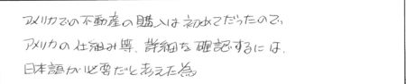 なんとか必要書類が日本から整い、24日の期限にHUD-1の計算書も出ました。26日当初の予定通りクロージングの日を迎え、売手の仲介士から鍵やガレージドアオープナーを受け取り引渡となりました。あ、実はもう一難ありました… クロージング当日に持って来る金額はHUD-1に書かれていますが、この金額のキャッシャーズチェックを銀行で作って来て下さい。個人の当座預金のチェックではNGです!クロージングの会社から、高木さんの口座のある銀行支店がすぐそばだったので、チェックを当日作りに行って頂きました。高木さん、ご新居へのご入居おめでとうございます!
