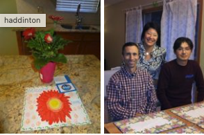 写真左下は福地さんが入居した際に置いてあった大家さんからのWelcomeギフト。右下写真は、大家さん、仲介者の私宮本亜希子に、テナントさんの福地さんです。