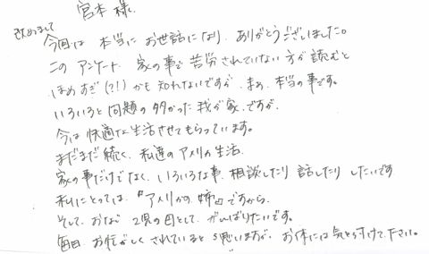 「何かがある度にとても困る。ここには安心して住めない。賃貸契約の解約が出来た暁には宮本さんに次の家探しをお願いしたい。」ご主人の出張も多く、生後間もない乳児と幼児を抱えた奥様から、ご相談を受けました。
