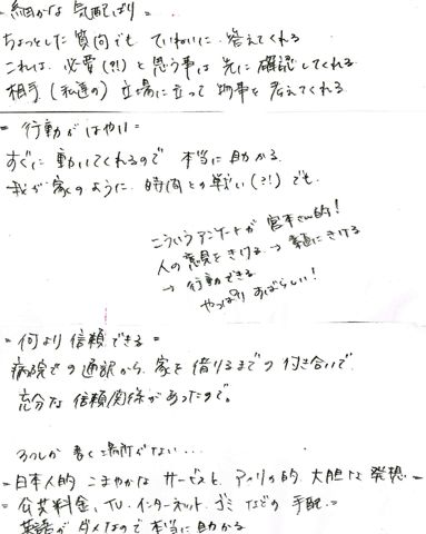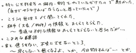 賃貸契約書を見せてもらったところ、”家の修理は全てテナント持ち”となっており契約期間も2年残っていました。そこで不動産契約に詳しい弁護士をご紹介しました。弁護士との面談後、大家さんに解約の交渉を開始したのが6月中旬。国外にいる大家さんから7月初旬に回答が来ました。いくつかの条件がついたものの、無事9月末での途中解約に了承、交渉成立。