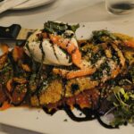 まずは前菜。茄子に濃厚なトマトソース、そしてフレッシュモッツァレラチーズと香り豊かな野菜とハーブの組み合わせが絶妙。モッツァレラチーズはまさに“口の中でとろける”感覚で、一品目から心を掴まれます。さらに、添えられるブレッドには良質なオリーブオイルとバルサミコビネガー。