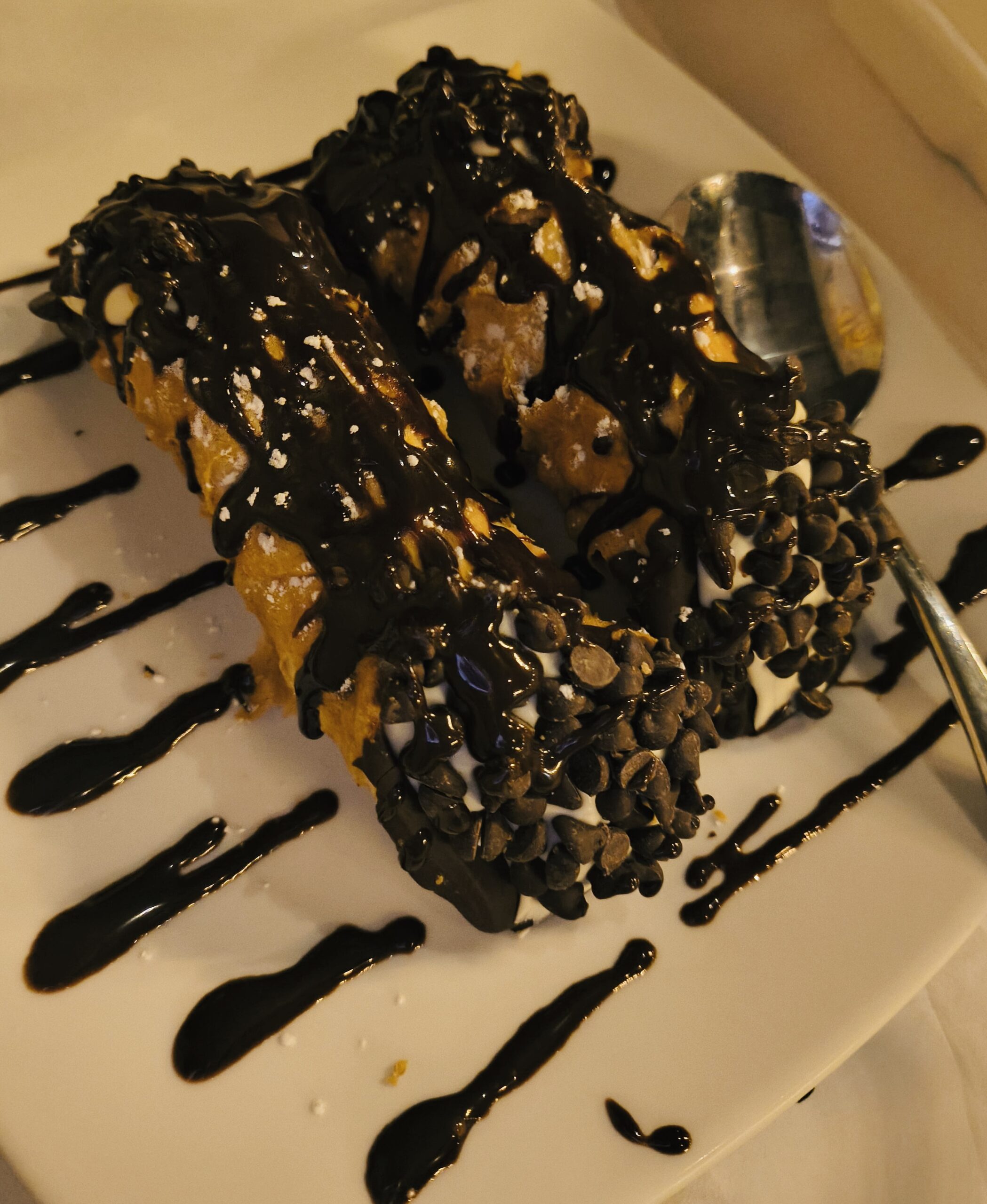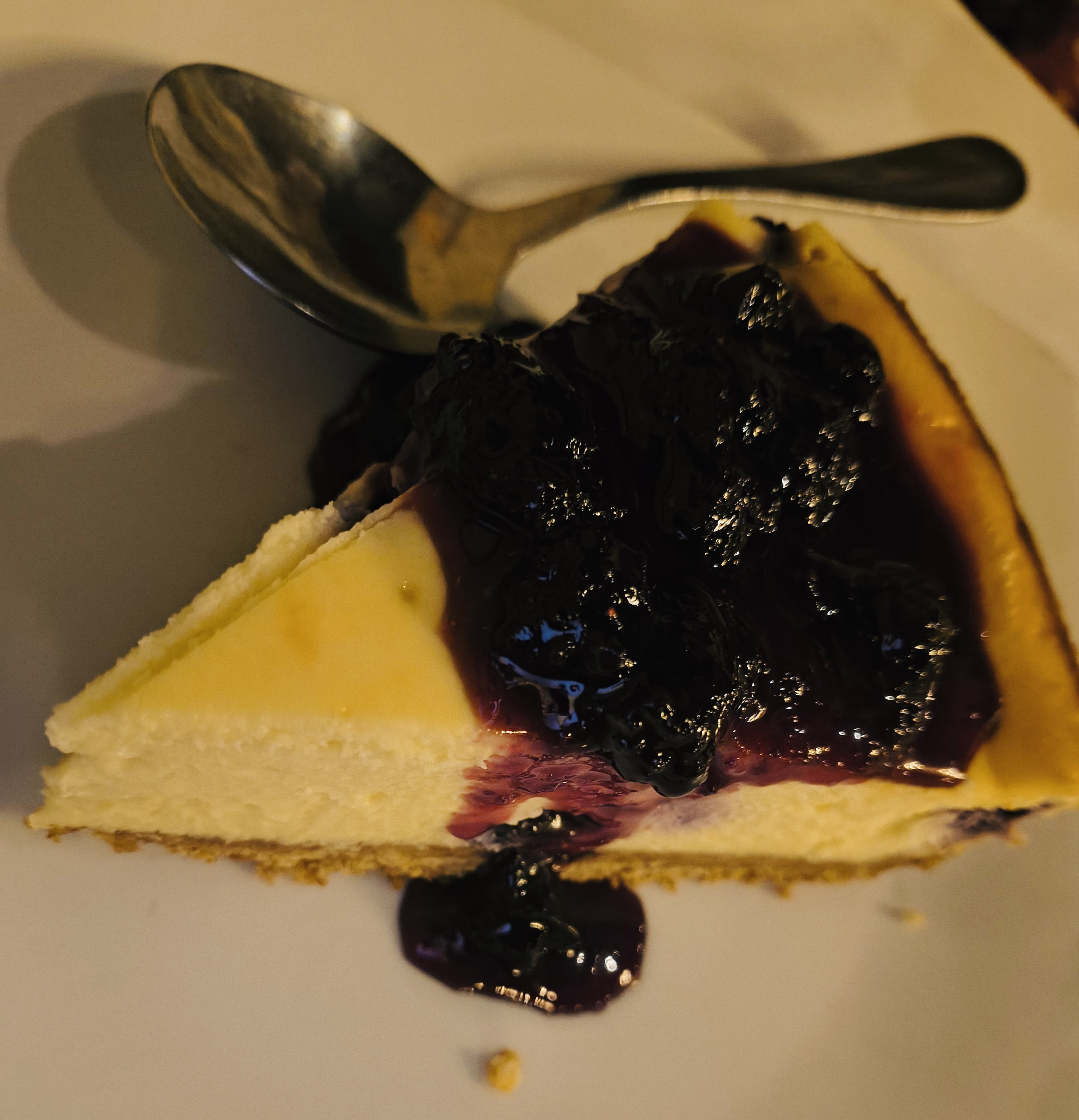 デザートのカノーリは甘すぎず、2つ付いてくるので家族や友人と分け合うのにぴったり。手作りのブルーベリーソースと濃厚なチーズケーキは、食後の幸せをさらに引き立ててくれます。