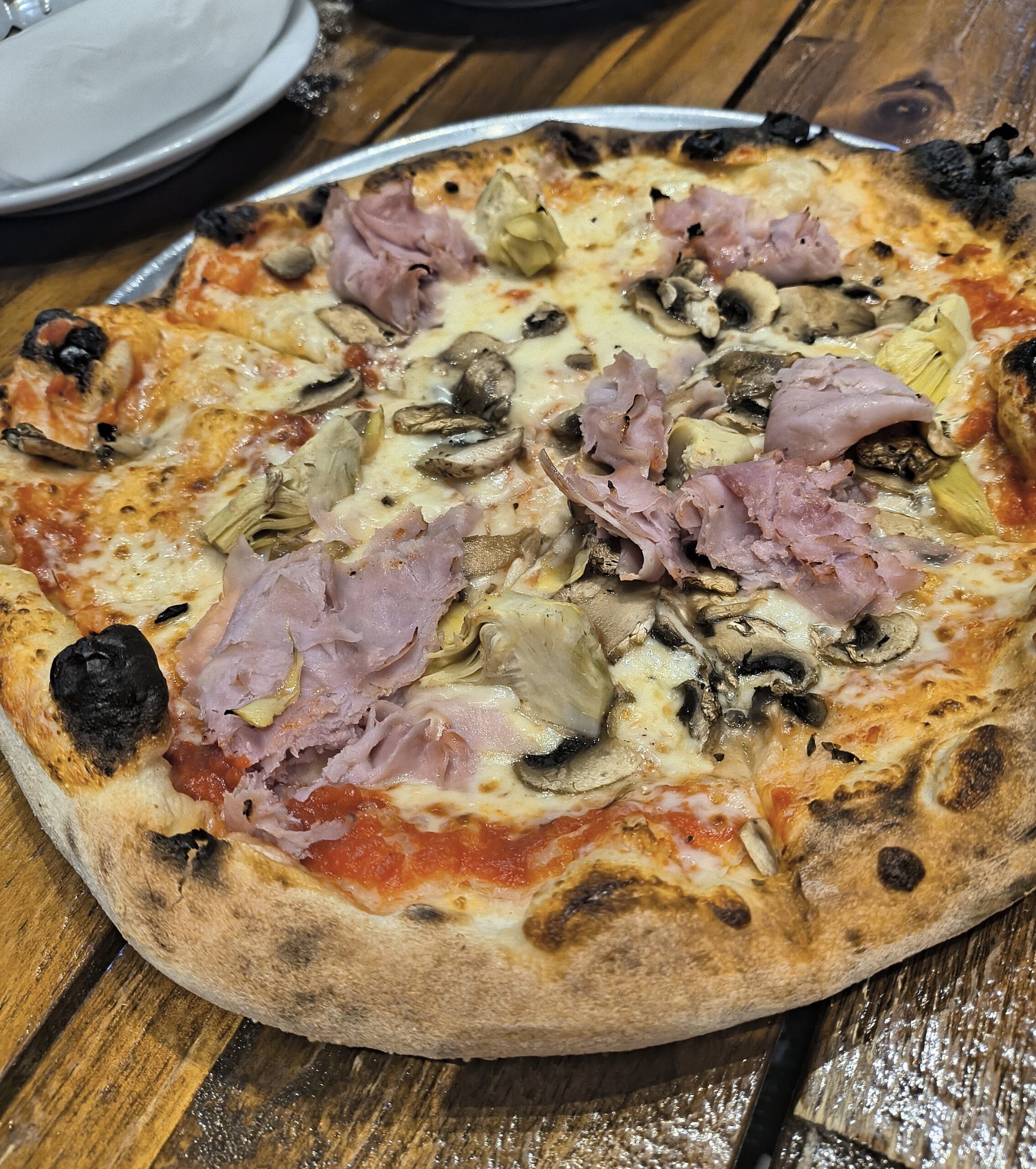 本格的なピザが楽しめるお店「I Tre Mori」店名の通り薪窯で焼き上げるピザが自慢のカジュアルイタリアンレストランです。お店の特徴はイタリアから取り寄せた本格的な薪窯。この窯で焼かれるピザが、外側が香ばしく中はもちもちしておりとても美味しいです。今回いただいたのは定番のマリゲリータとハム、アーティチョーク、マッシュルームが乗った具沢山のピザ。どちらも絶品でした。週末という事もあり、店内はお客様で賑わっておりました。ドライブスルーも完備されております。ぜひ一度、足を運んでみてはいかがでしょうか?