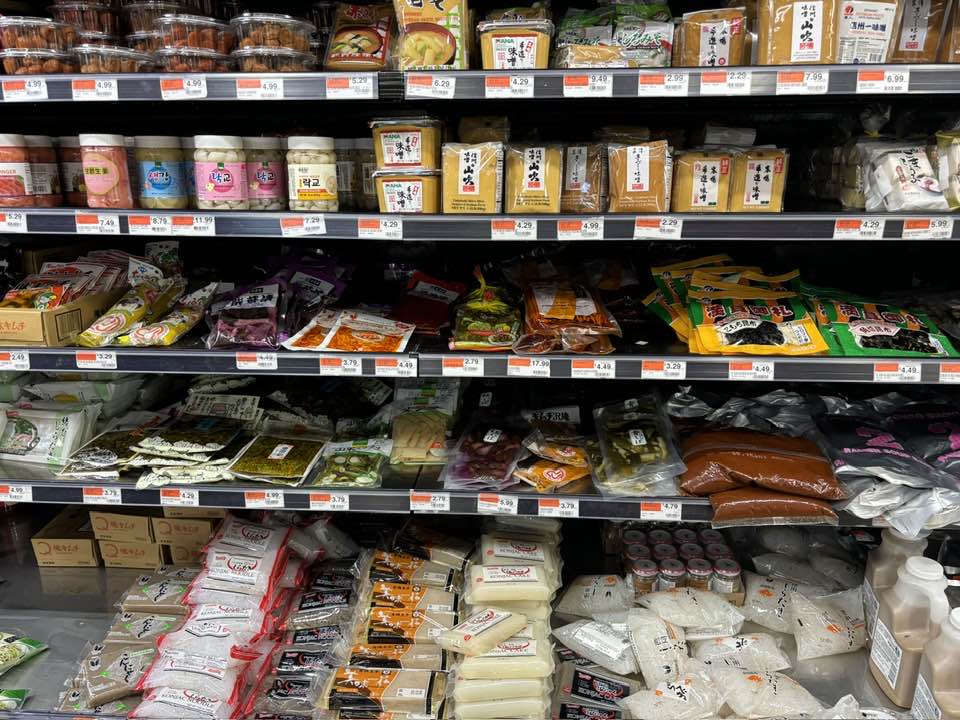 メトカフにある韓国系のスーパーマーケット。品揃えが豊富で日本人なら誰でも利用しているのではないでしょうか。冷凍の薄切り肉や、冷凍の海鮮類、冷凍うどんや、餃子などの日本のメーカーの冷凍食品も豊富です。お惣菜コーナーには日本人でも馴染みのある韓国のキンパ、チャプチェ等も並ぶことがあり、手作りキムチも多く並んでいます。日本の醤油、酒、みりん、出汁、お酢などひと通りの調味料はしっかり揃いますし、お鍋のスープの素や、焼肉のタレ、マヨネーズ、ふりかけ、鰹節など、日常的に使いたいものも多く手に入ります。日本のお菓子やジュースが買えるのも嬉しいですね。冷凍の納豆、もずく、野菜、しらす、たらこ、焼きそばなんかもあります。日本のお米やインスタントラーメンもあります。生野菜やきのこのコーナーもありますよ。こちらへ来れば、日系、韓国系の食材がまとめて手に入るので便利ですね。