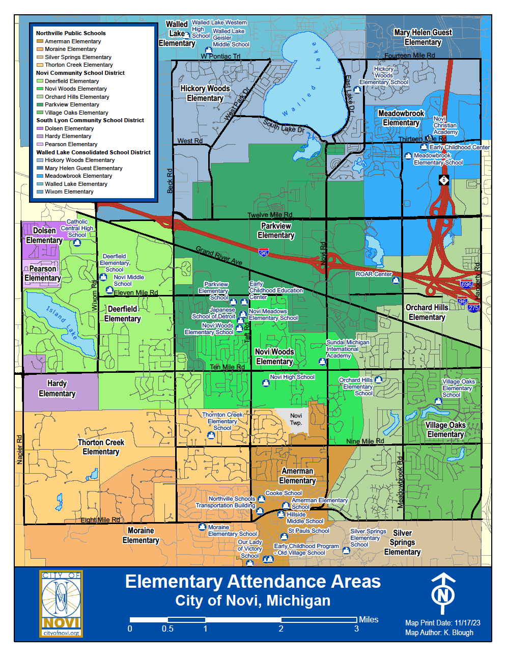 小学校キンダーから4年生までが5校:Deerfield Elementary, Novi Woods Elementary, Orchard Hill Elementary, Parkview Elementary, Village Oaks Elementary