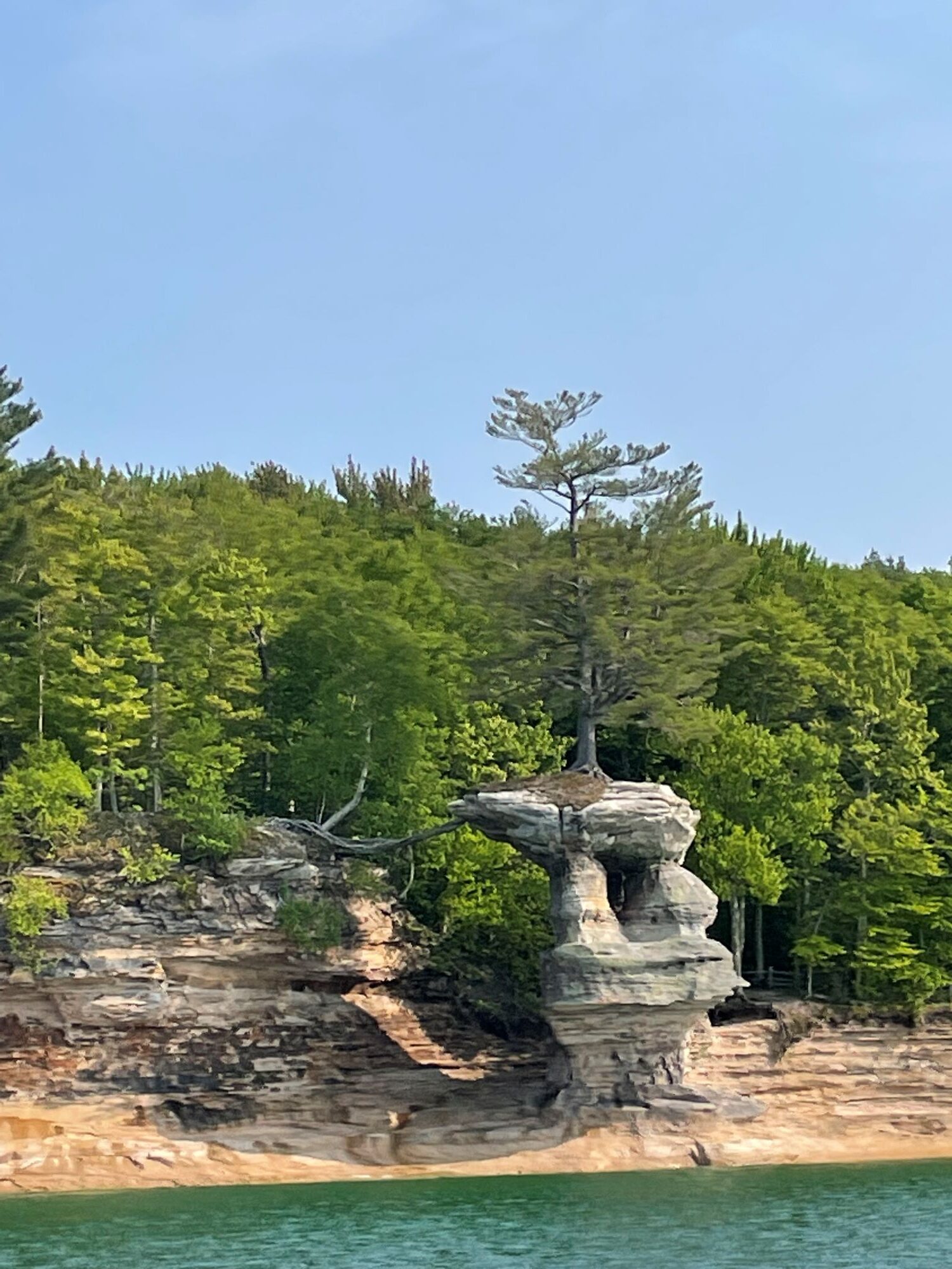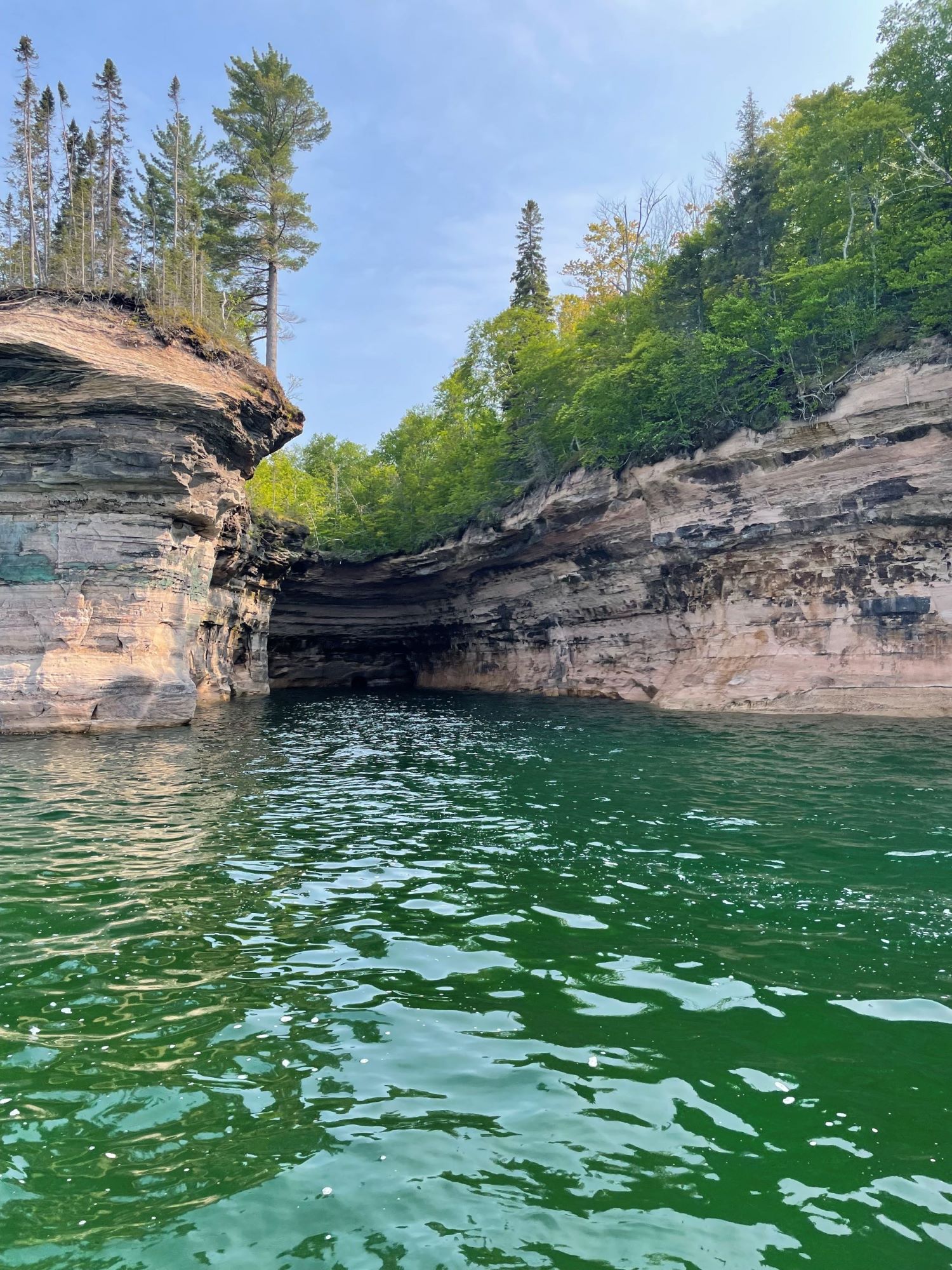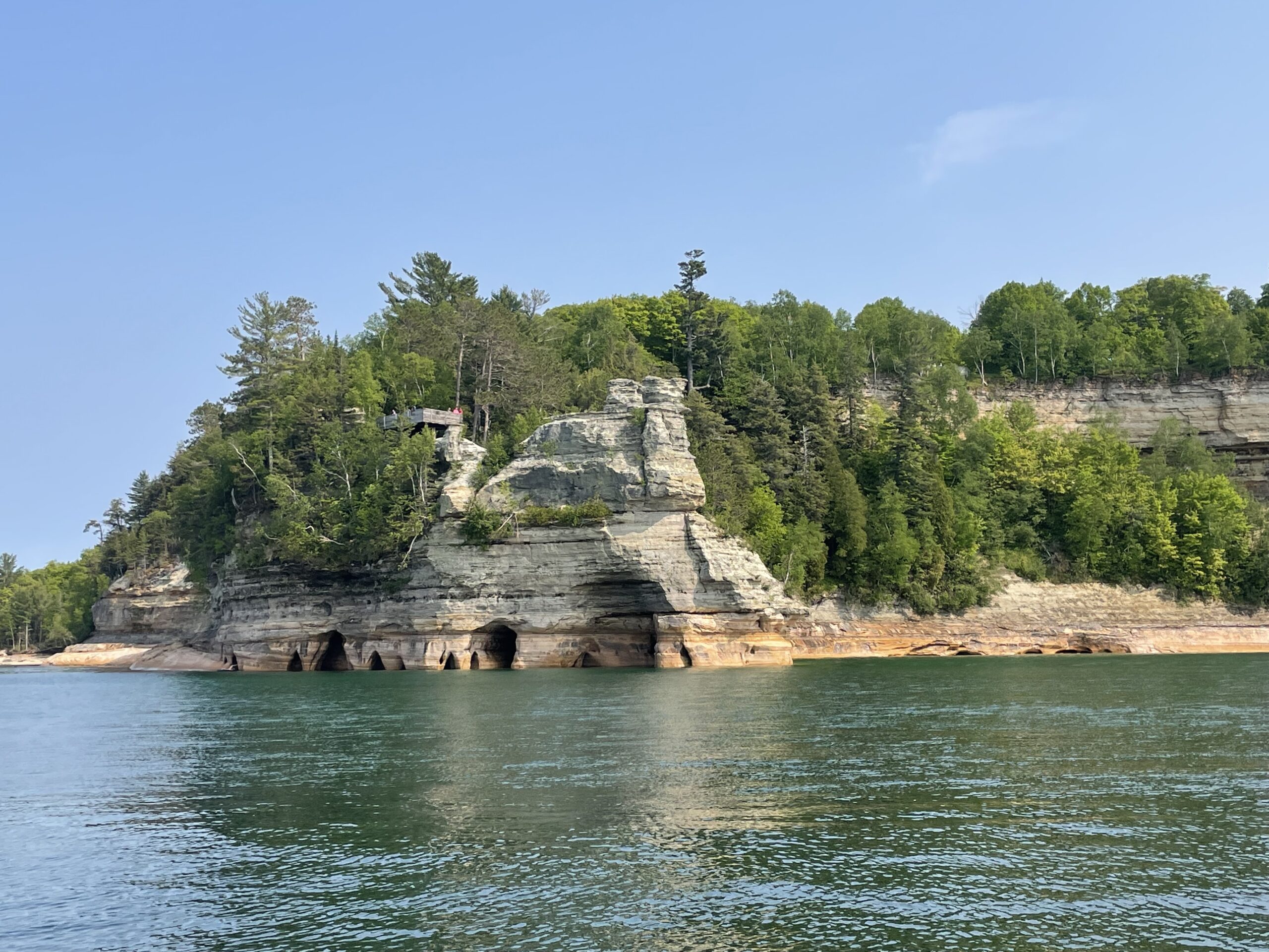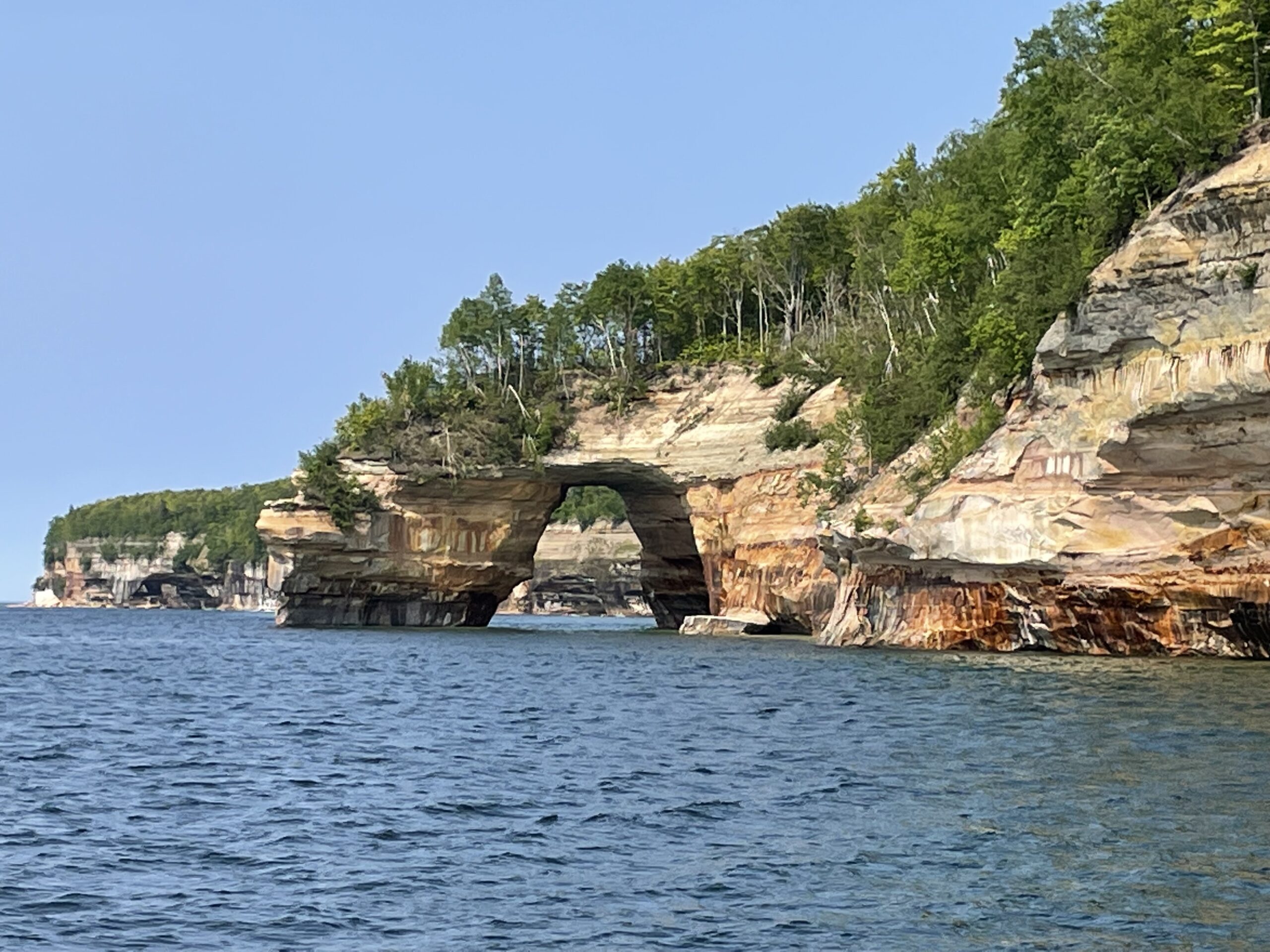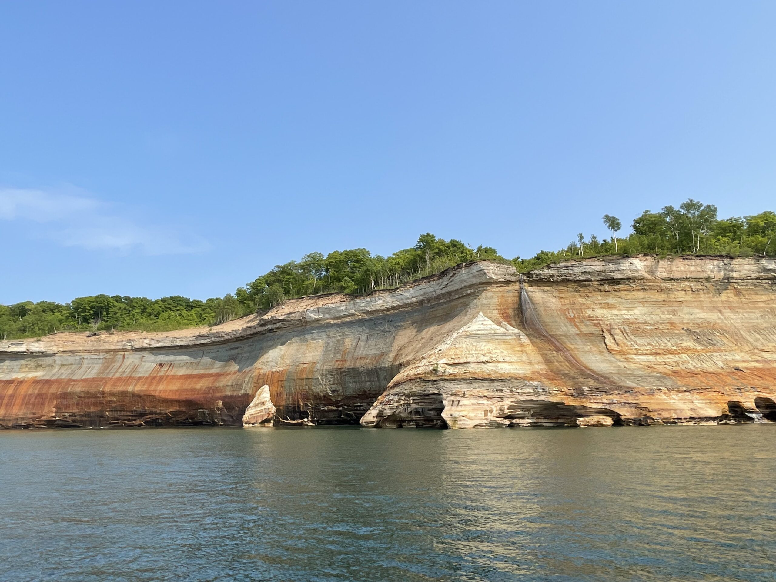 ミシガン州は五大湖によって二つの半島に分断されたちょっと変わった地形ですが、その北側の半島(アッパーペニンシュラと呼ばれています)で特に人気の観光地がピクチャードロックスです。ノバイから車で約6時間北上し、左にミシガン湖、右にヒューロン湖を見ながらマキナックブリッジ(全長約8㎞)を渡るのですが、こんなに長い橋を渡ってもまだ同じ州だというのがなんだか不思議な感じです。ピクチャードロックスは五大湖のひとつであるスペリオル湖に面し、色鮮やかな砂岩で形成された崖がおよそ24㎞に渡って広がっています。この砂岩は5~6億年前に出来たものということですが、そんなにも大昔の地層を広範囲に渡って眺めることが出来るなんて驚きです。公園内にはぜひ目に収めておきたいスポットがいくつかあります。トレッキングやカヌーをしながら見ることも出来るのですが、これらのスポットを全部見たい、でも体力にあまり自信が無い・・・という方には、2時間のクルージングがおすすめです。スタッフの方の解説を聞きながら、座ってのんびりと絶景を楽しむことが出来ます!(クルージングの情報はこちら)