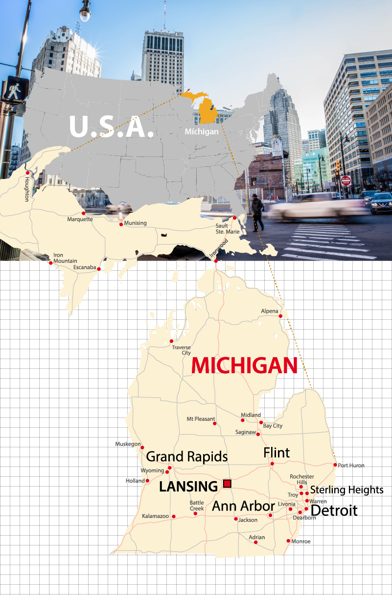 ミシガンはアメリカで8番目に人口の多い州です。ネティブインディアンの言葉で「大きな湖」という意味です。ロウアー半島とアッパー半島の2つの大きな半島から成り立ち、五大湖のうち4つの湖に面しています。泳げるビーチもたくさんあり、塩水ではなくフレッシュウォーターなので、泳いだ後も肌にベタつかずサラッとしているのも高ポイントです。州内では、とうもろこし、大豆、小麦、じゃがいもなど、たくさんの穀類や野菜、果物が作られています。秋になると登場するアップルサイダーも特筆すべき飲み物でしょう。また、マンモス校の「ミシガン大学」があるため、若者も多く、街はいつも活気に溢れています。近年は、デトロイトのダウンタウンから北へ向かう路面電車ができたり、古い建物を改装して再利用するなどの開発も進んでいます。大自然に恵まれた緑の多い州です。また、日曜のダウンタウンは駐車場が無料になるので、覚えておくと便利です。