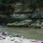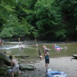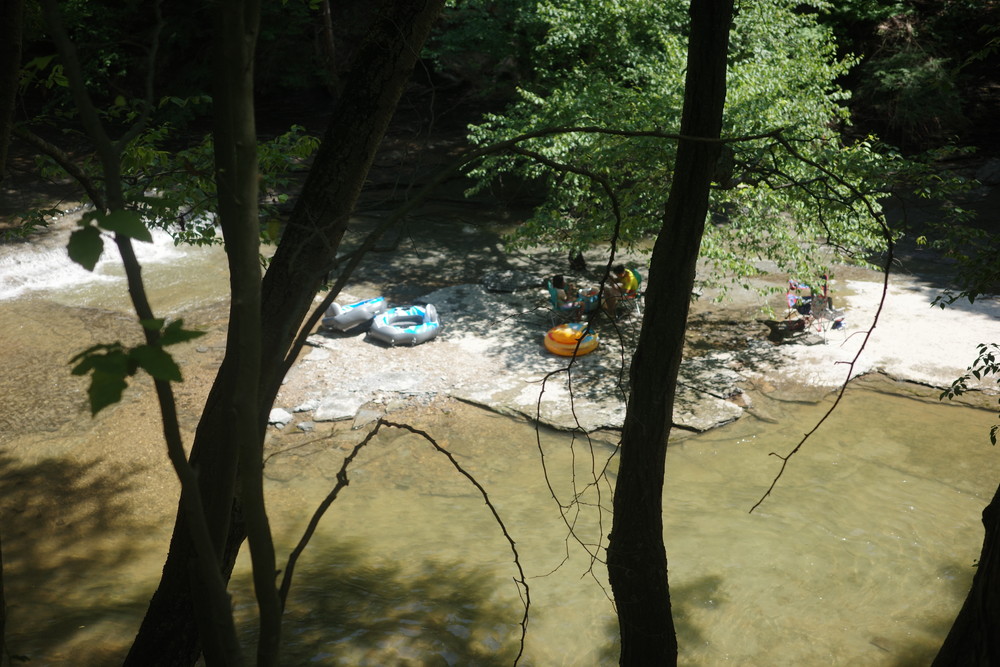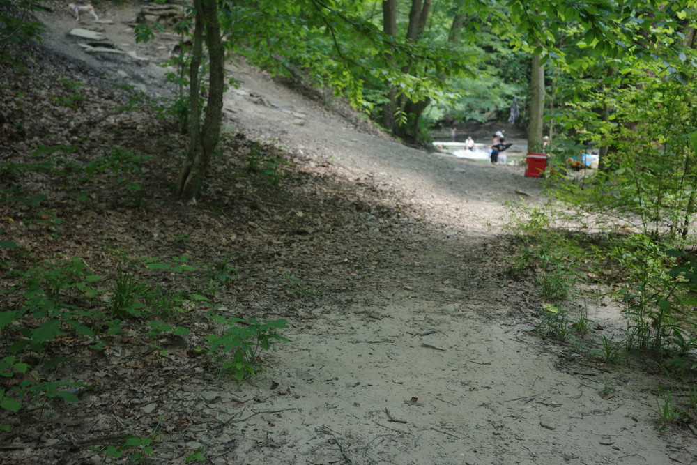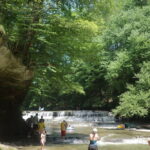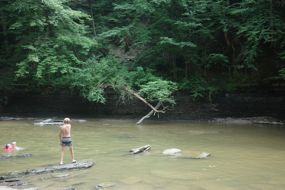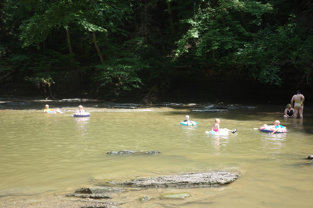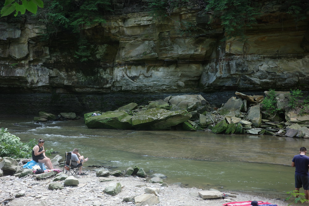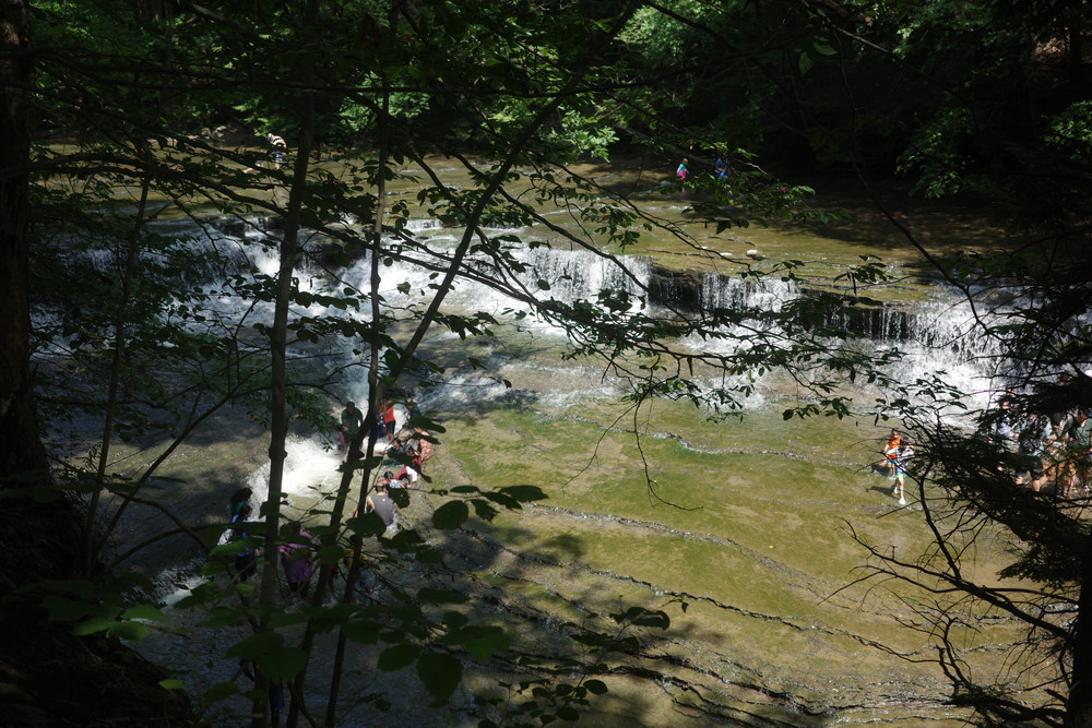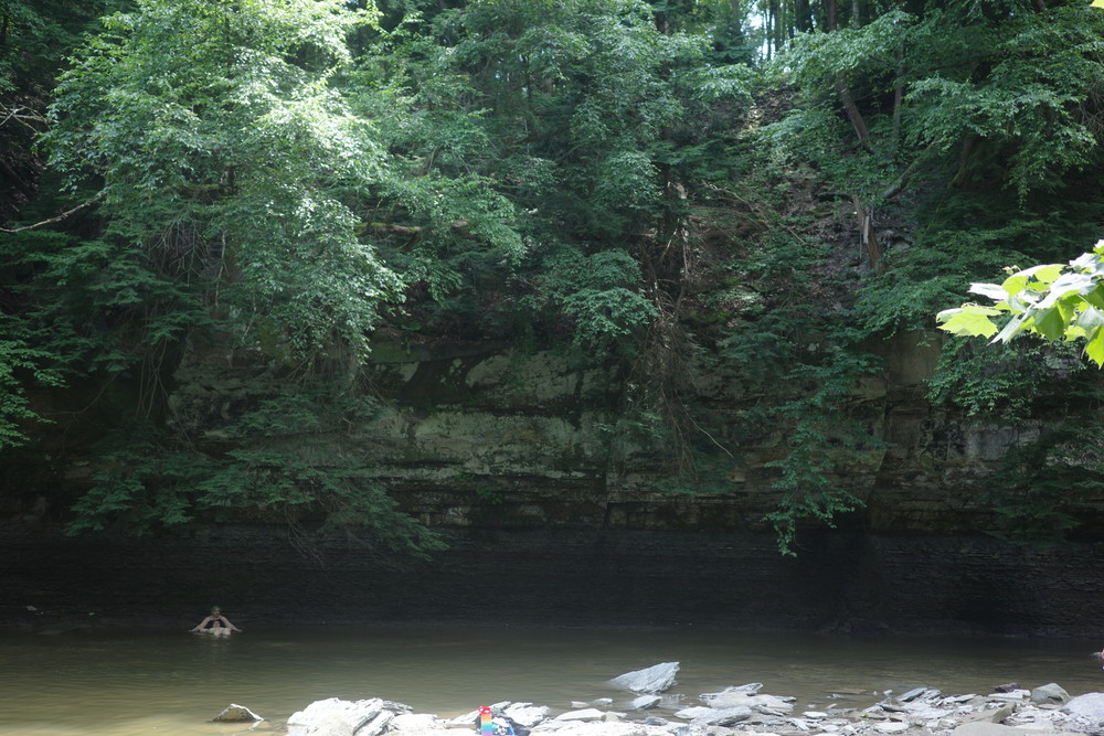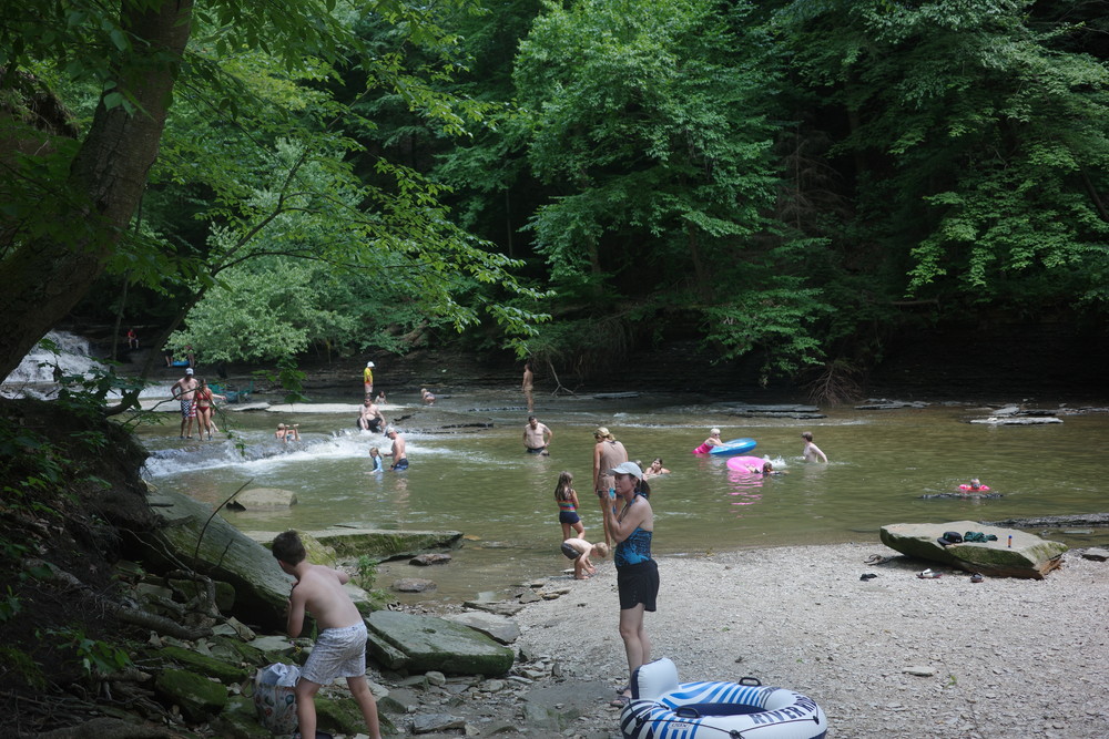 オハイオ州ベントリービルの「Quarry Rock Picnic Area」から少し奥へ歩いた先に、夏の隠れた人気スポットがあります。それがこの「Big Waterfall and Swimming Hole」。地元の人たちの間で知られる、天然の遊び場です。