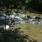 緑に囲まれた渓流の中を進むと、幅の広い滝が現れ、その下にできた深さのある天然プールのようなエリアが広がります。特に滝の下は、水の流れがぐるりと回るように流れていて、まるで流れるプールのような楽しさ! フロート(浮き輪やチューブ)を持っていけば、何時間でも遊んでいられます!