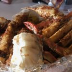 写真:シーフードボイル(スノークラブとブルーグラブ)、最後に残るタレにサイドのスチーム野菜を入れて食べる、その他アペタイザー、スープ、ディナーなどあり