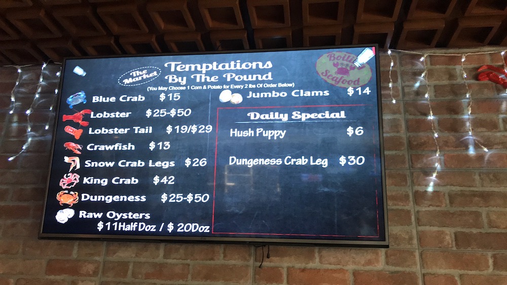 黒板にある今日のシーフードメニューから好きなものを1ポンド単位でチョイス、好みのシーズニングに辛さを選んで食べる。看板商品のシーズニングHomemade Juicy(Baby Spicyhは辛くない)は言うなら「食べる辣油」。シーフードを食べ終わったらサイドメニューにあるスチーム野菜やご飯を注文してみて。シーフードと最後の仕上げどっちが美味しかったか分からないくらいの満足度!