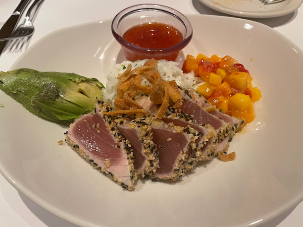 The pictures below are:Sourdough Bread (complimentary), Iced Shellfish Platter (small), sauces for the platter, Ahi Tuna Tartare, Sampler (4oz. Filet and 3oz. Lobster tail:Happy Hour menu), Heirloom Tomato & Burrata Salad, Maryland Crab Bisque, Blue Cheese Potato Chips