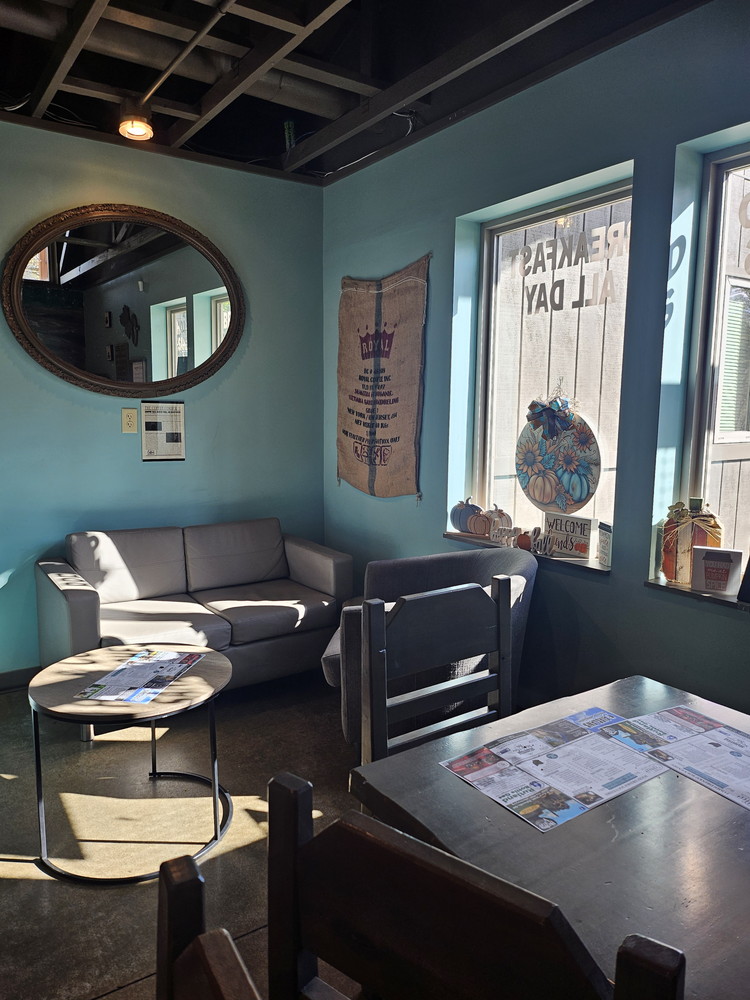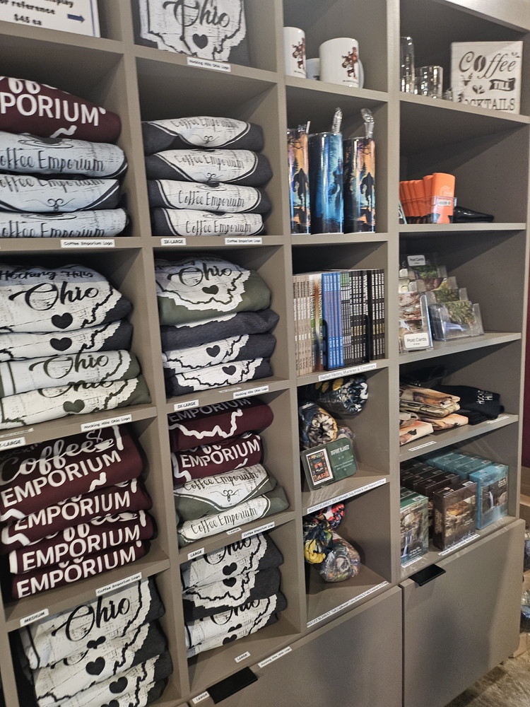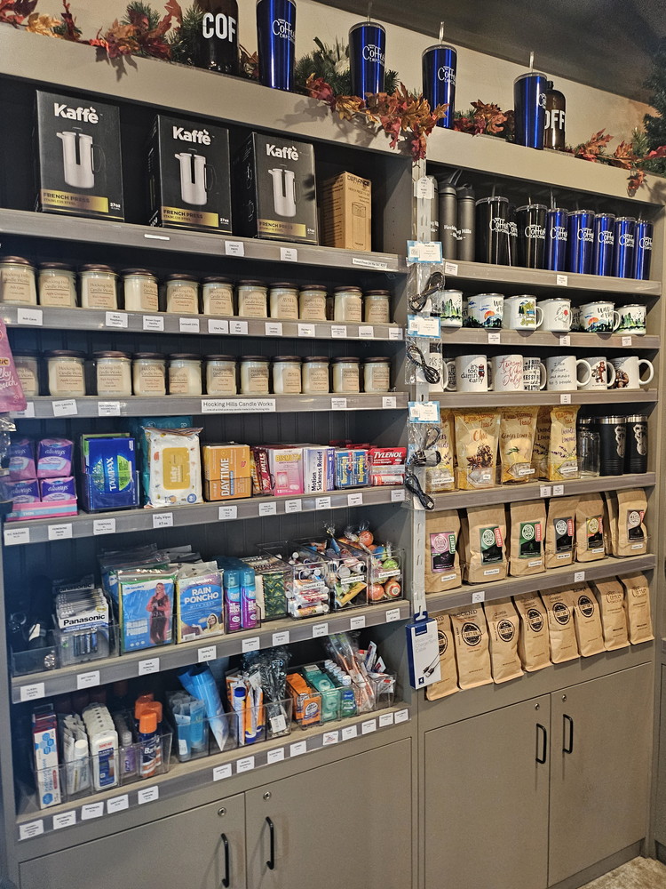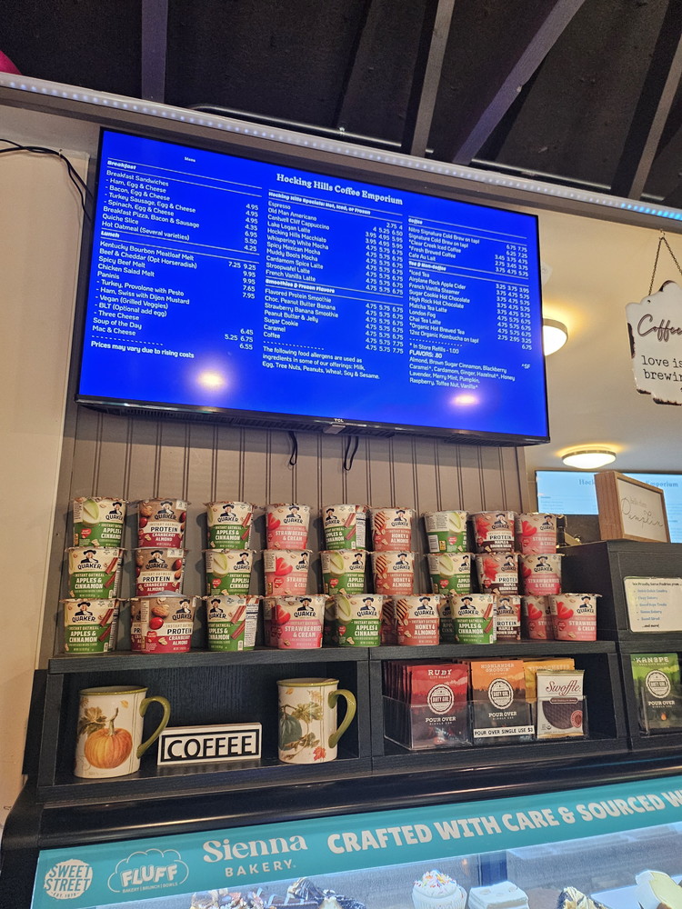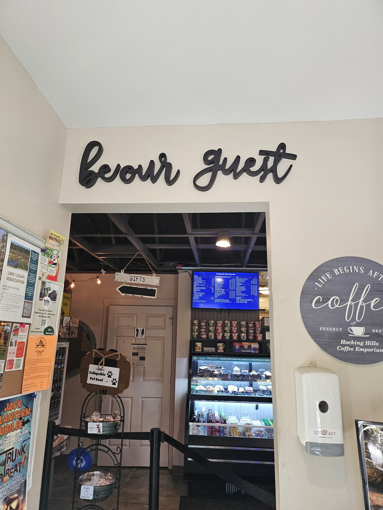 Coffee Emporium は、ホッキング・ヒルズの緑に囲まれた静かなカフェです。店内は木の温もりが感じられる落ち着いた空間で、ハイキングのあとに立ち寄るのにちょうどいい雰囲気。香りのよいコーヒーはもちろん、ナイトロコールドブリューやコンブチャなど、ちょっと珍しいドリンクも楽しめます。