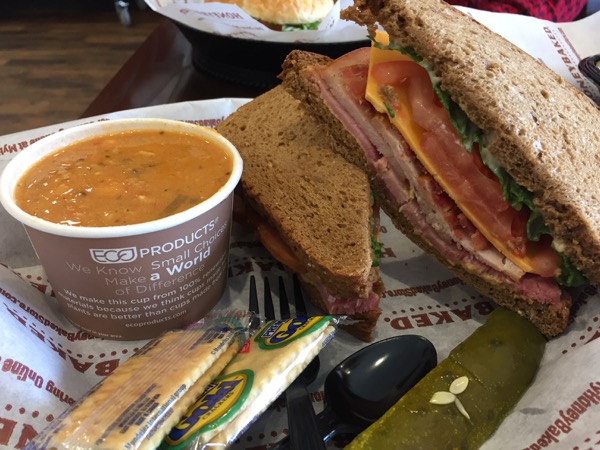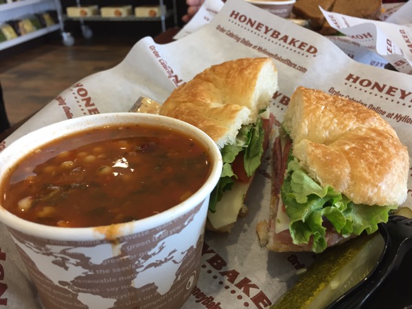 カウンターで注文して、サンドイッチ、スープ、サラダが楽しめます。ランチをしていると地域の方が丸ごとのハムを買っていくのがどうしてか分かります。