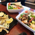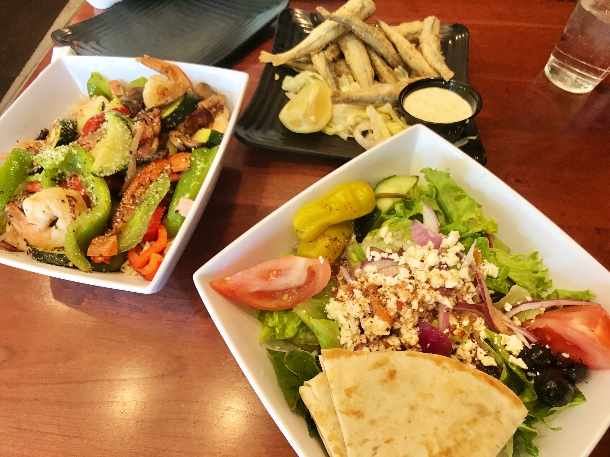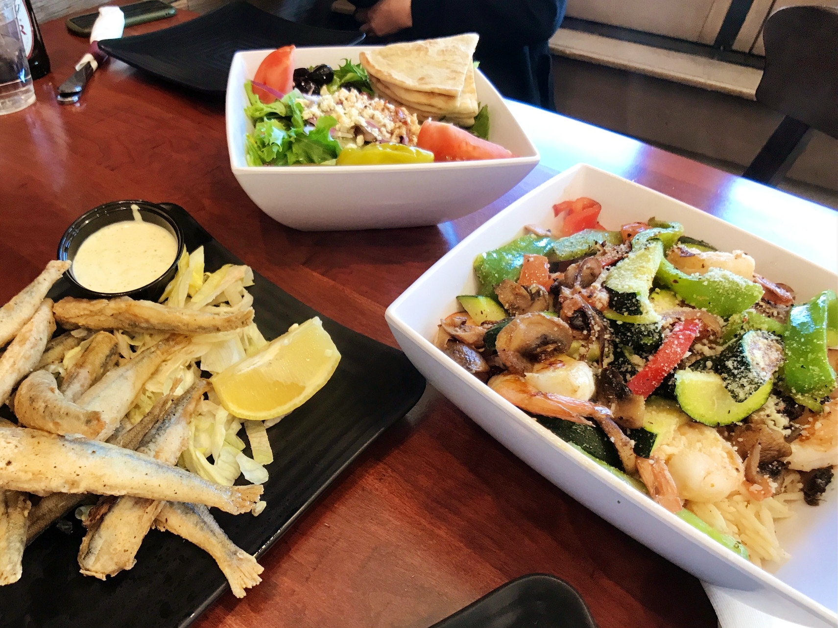 今回注文したのはグリークサラダ、(Greek Salad)、エーゲ海風エビ料理(Aegean Style Shrimp)、ワカサギのフライ(Smelts)。
