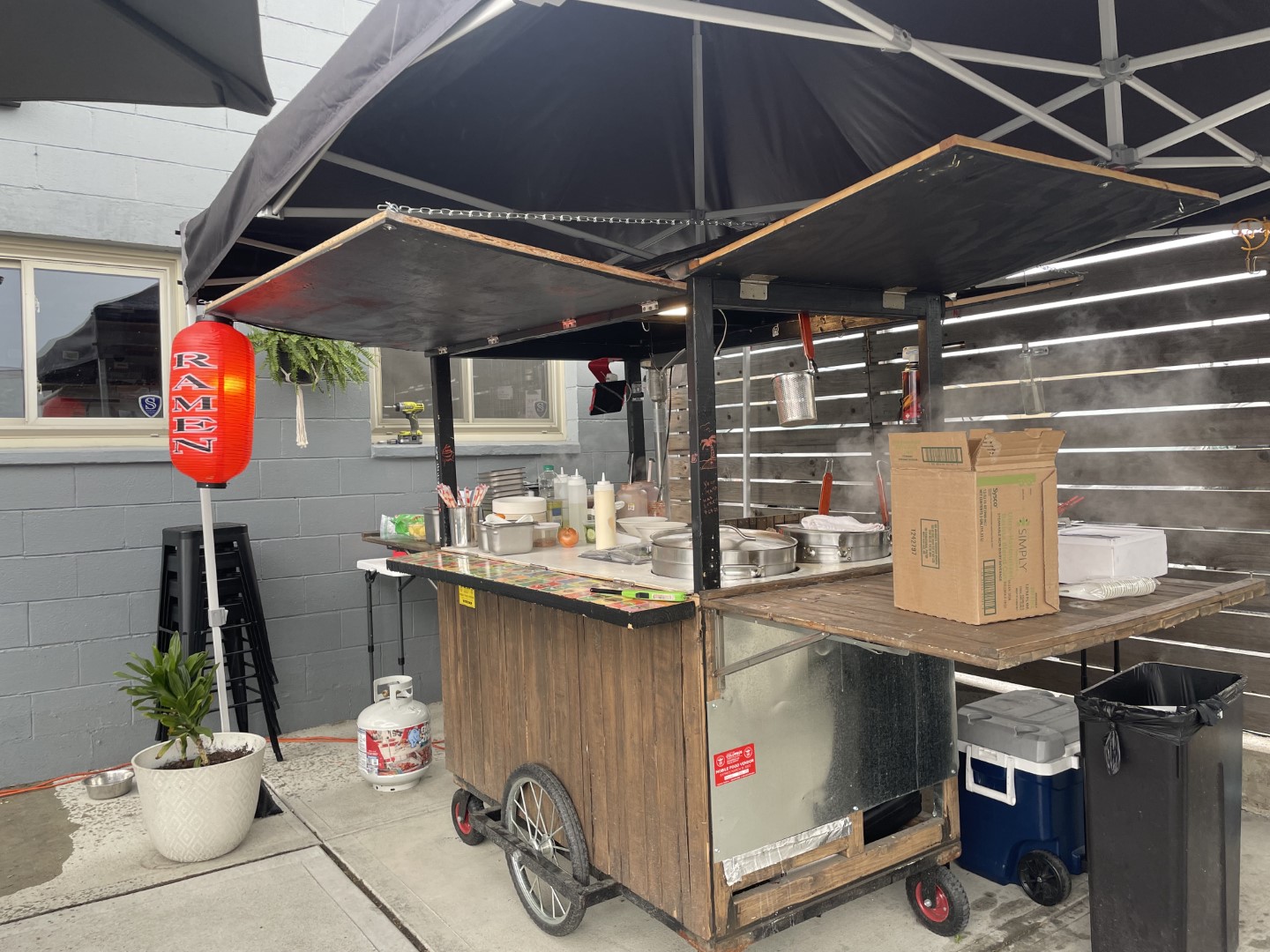 野外のピクニックテーブル、またはEcho Spiritsの店内でカクテルを飲みながら注文することもできます(店内で注文すると席までラーメンを持ってきてくれます)