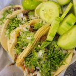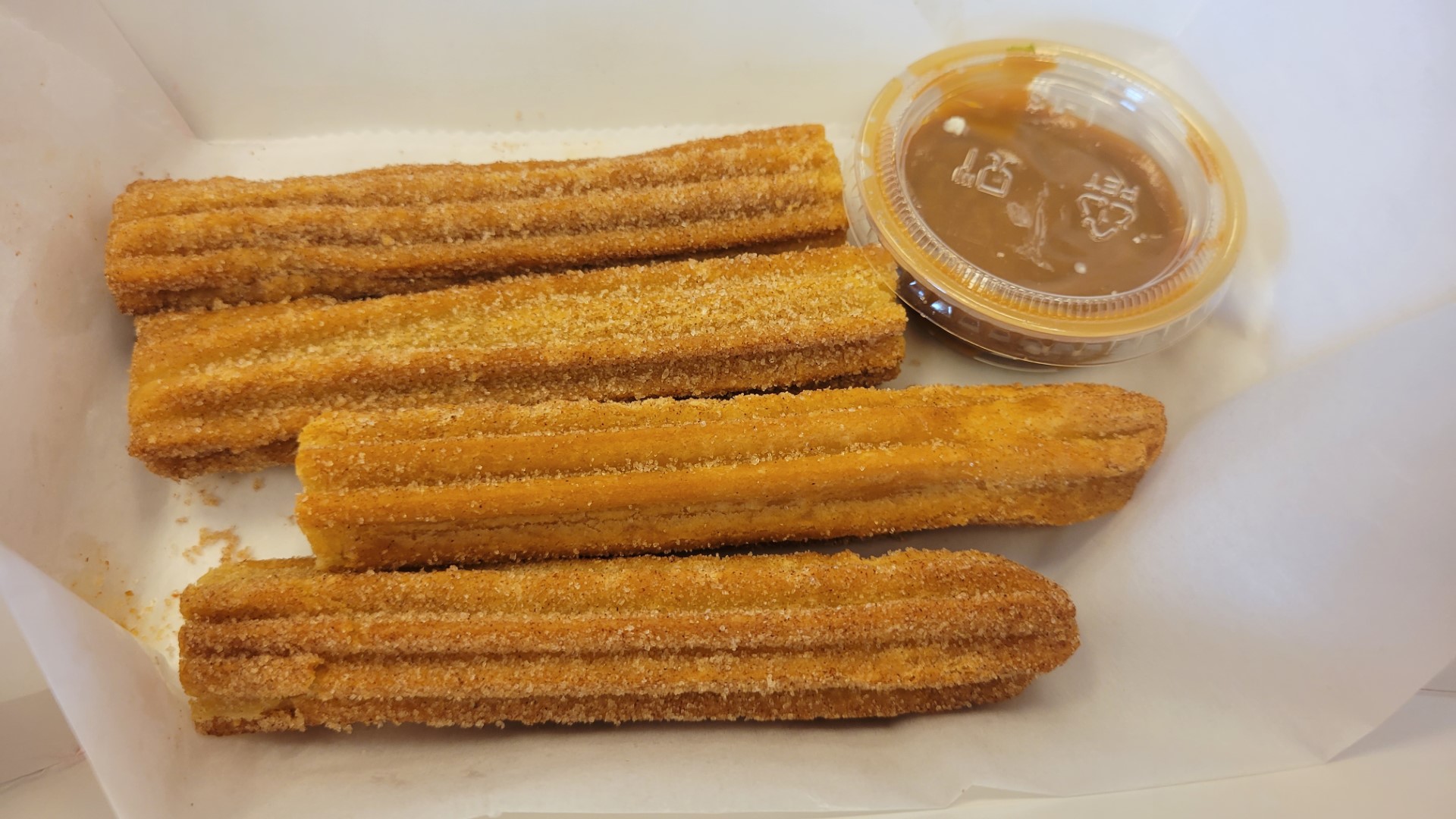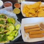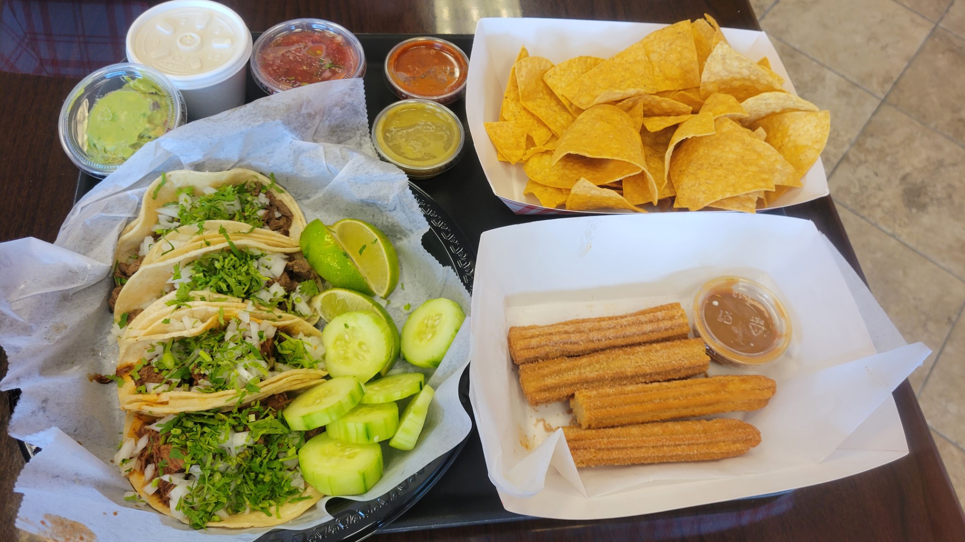 注文したものはメキシカンストリートタコスのアサダとバルバコアを二つずつ、チップスとディップソース(ワカモレ・チーズ・トマトサルサ)にチュロスです。