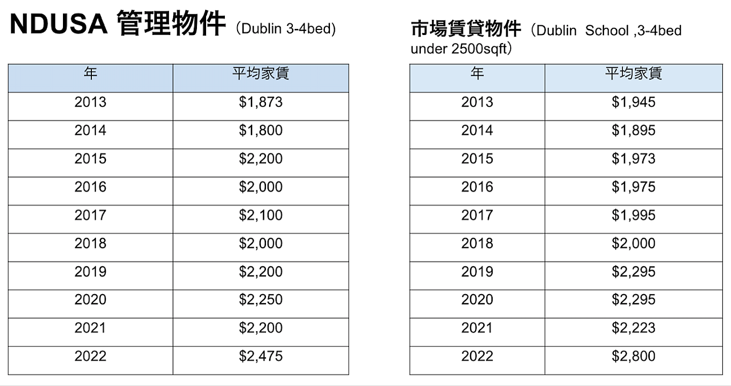 April 16, 2022October 18, 2024 ダブリン学区の家賃相場は上の表をご覧ください。 年々家賃は上昇していますが、2019年以降、弊社管理物件の賃料が市場相場より低い状態が続いています。