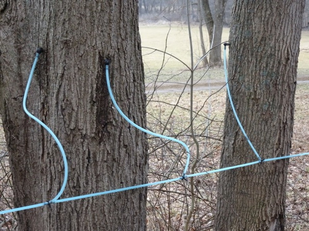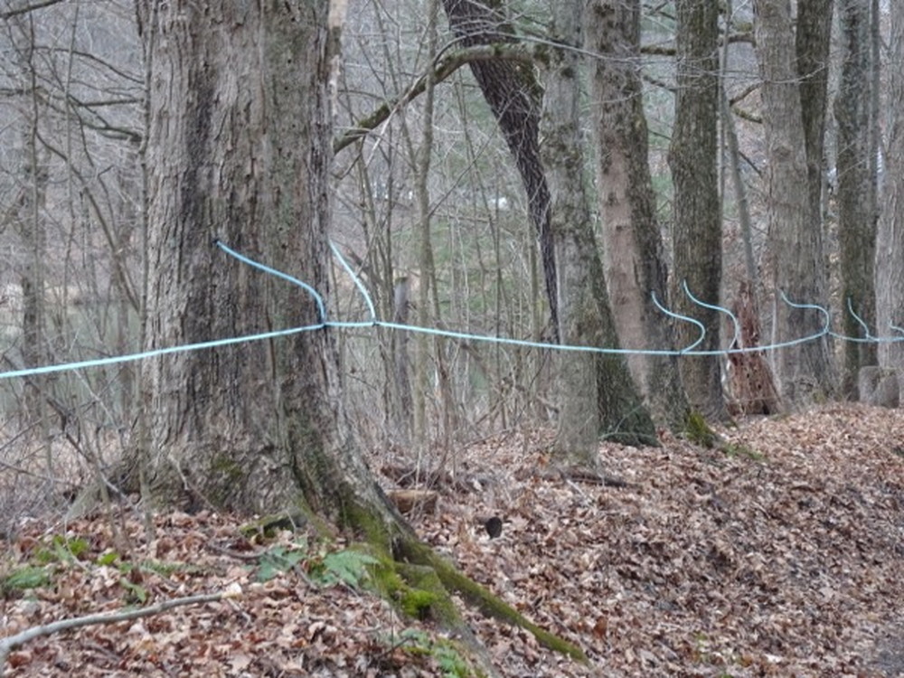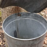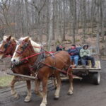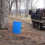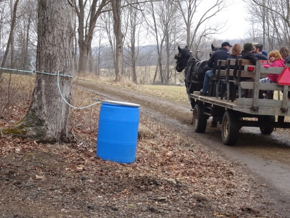 集合場所ではこんな感じに迎えに来る馬車に乗って会場まで向かいます。しばらくすると木々にメープルシロップを採集する管が付いていたりバケツがあったりするのが見えて来ます。